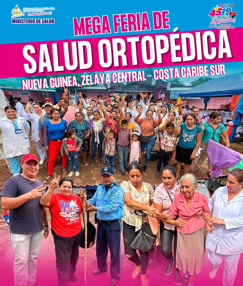 Este Viernes 26 y Sábado 27 de Abril, el Buen Gobierno Sandinista realizó una Mega Feria Salud Ortopédica en el Hospital Primario Jacinto Hernández, Nueva Guinea, Zelaya Central, donde se brindaron 12,033 atenciones en salud, a 4,011 protagonistas de los municipios Muelle de los Bueyes, El Rama, El Coral, Nueva Guinea, Bluefields, El Almendro y San Miguelito-Río San Juan.