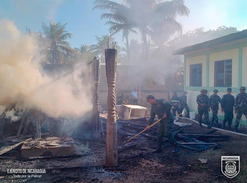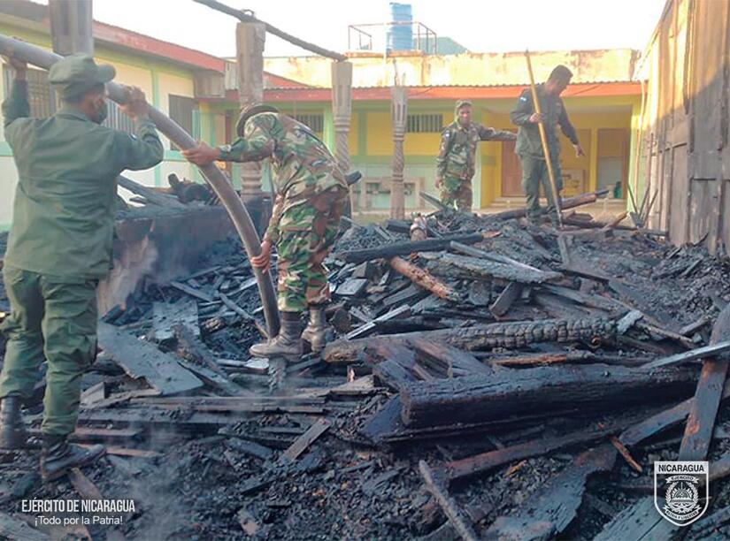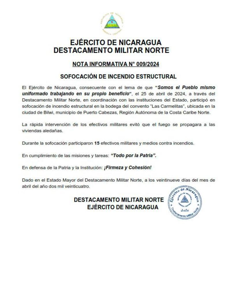 El Ejército de Nicaragua, consecuente con el lema de que "Somos el Pueblo mismo uniformado trabajando en su propio beneficio", el 25 de abril de 2024, a través del Destacamento Militar Norte, en coordinación con las instituciones del Estado, participó en sofocación de incendio estructural en la bodega del convento "Las Carmelitas", ubicada en la ciudad de Bilwi, municipio de Puerto Cabezas, Región Autónoma de la Costa Caribe Norte.