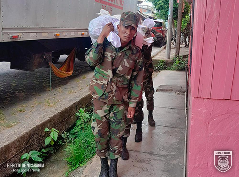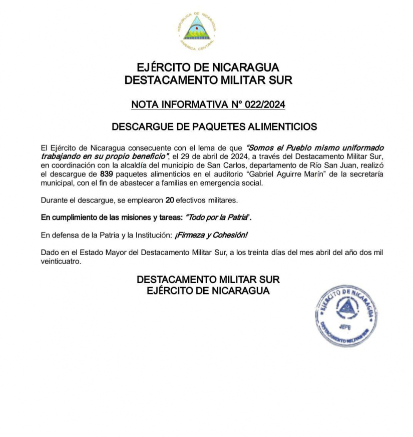 El Ejército de Nicaragua consecuente con el lema de que "Somos el Pueblo mismo uniformado trabajando en su propio beneficio", el 29 de abril de 2024, a través del Destacamento Militar Sur, en coordinación con la alcaldía del municipio de San Carlos, departamento de Río San Juan, realizó el descargue de 839 paquetes alimenticios en el auditorio "Gabriel Aguirre Marín" de la secretaría municipal, con el fin de abastecer a familias en emergencia social.