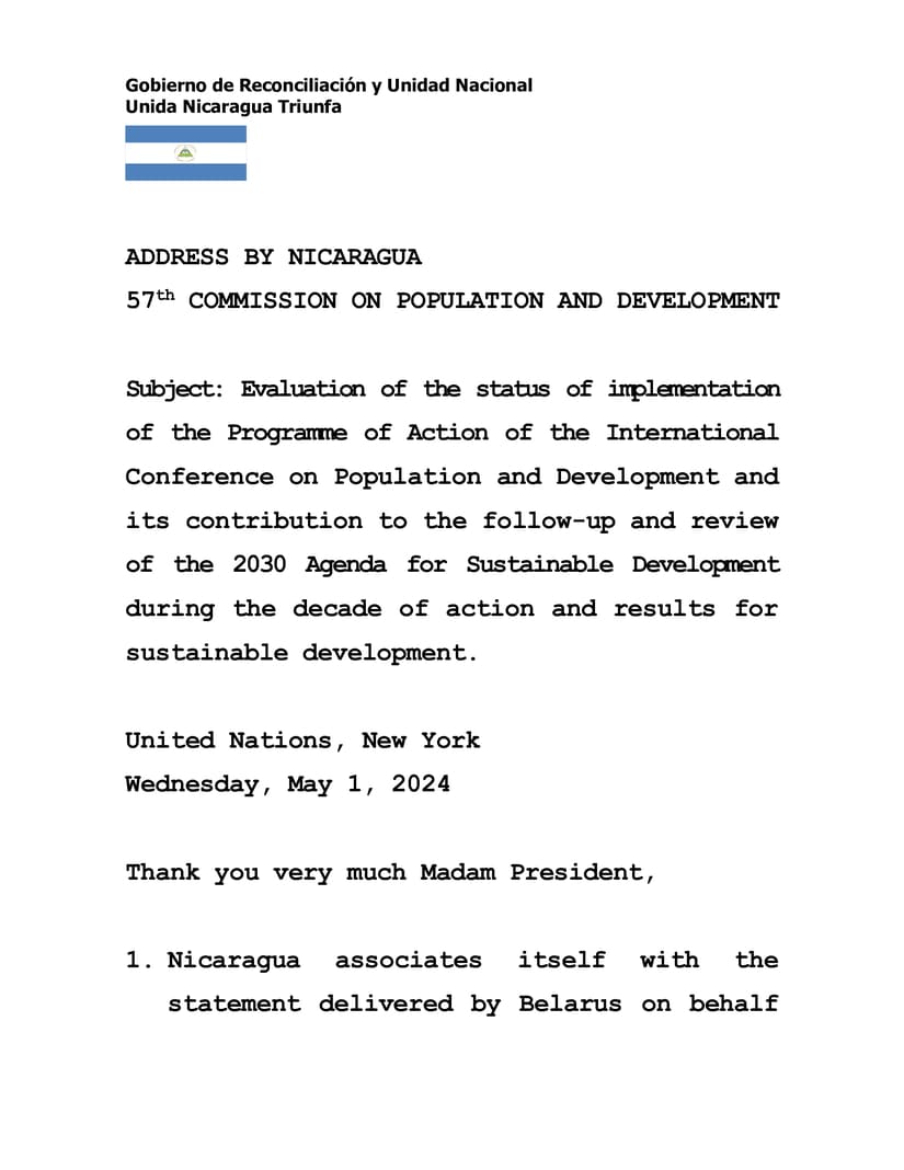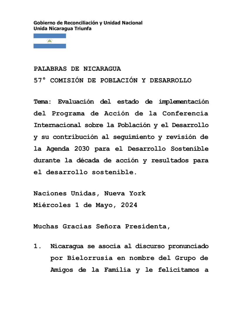 1. Nicaragua se asocia al discurso pronunciado por Bielorrusia en nombre del Grupo de Amigos de la Familia y le felicitamos a Usted y a los miembros del Buró por su elección, así como por la preparación de este Período de sesiones de la Comisión de Población y Desarrollo.