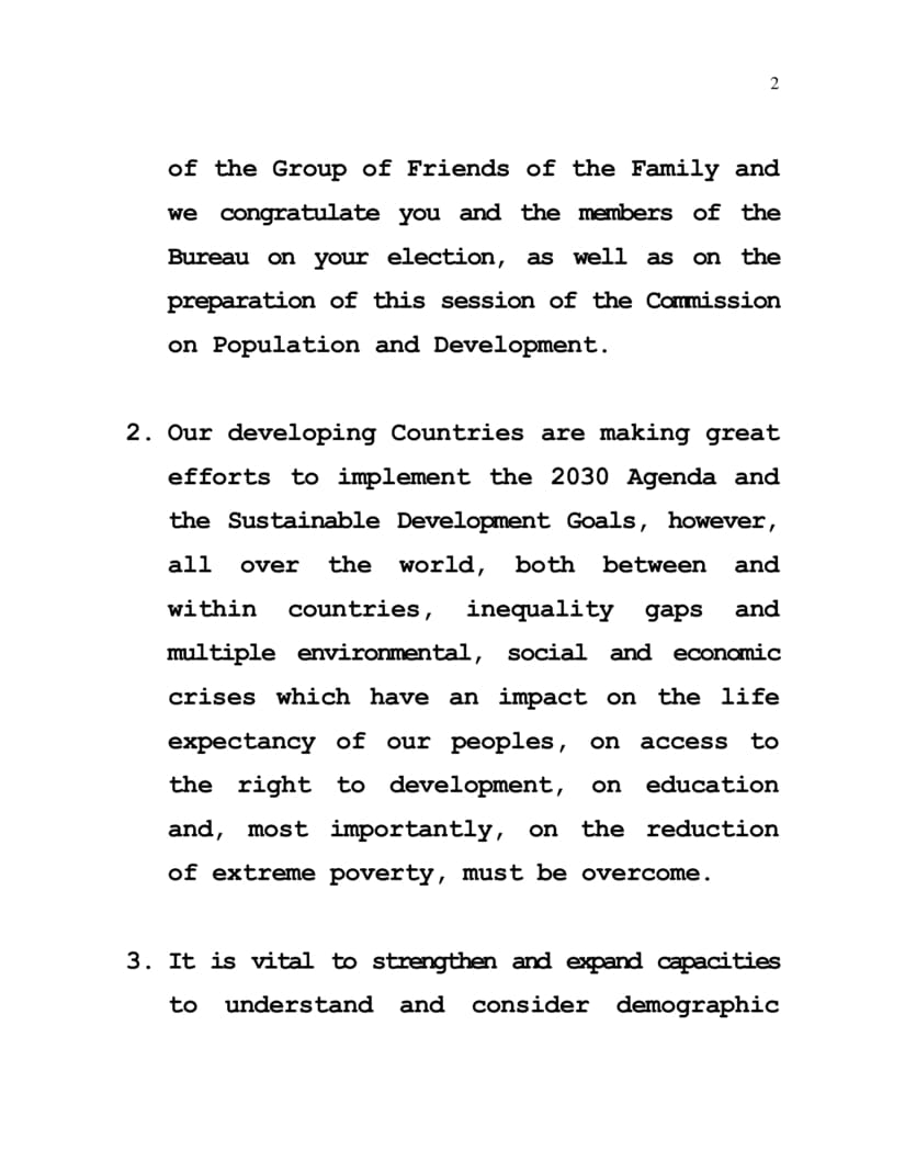 1. Nicaragua associates itself with the statement delivered by Belarus on behalf of the Group of Friends of the Family and we congratulate you and the members of the Bureau on your election, as well as on the preparation of this session of the Commission on Population and Development.
