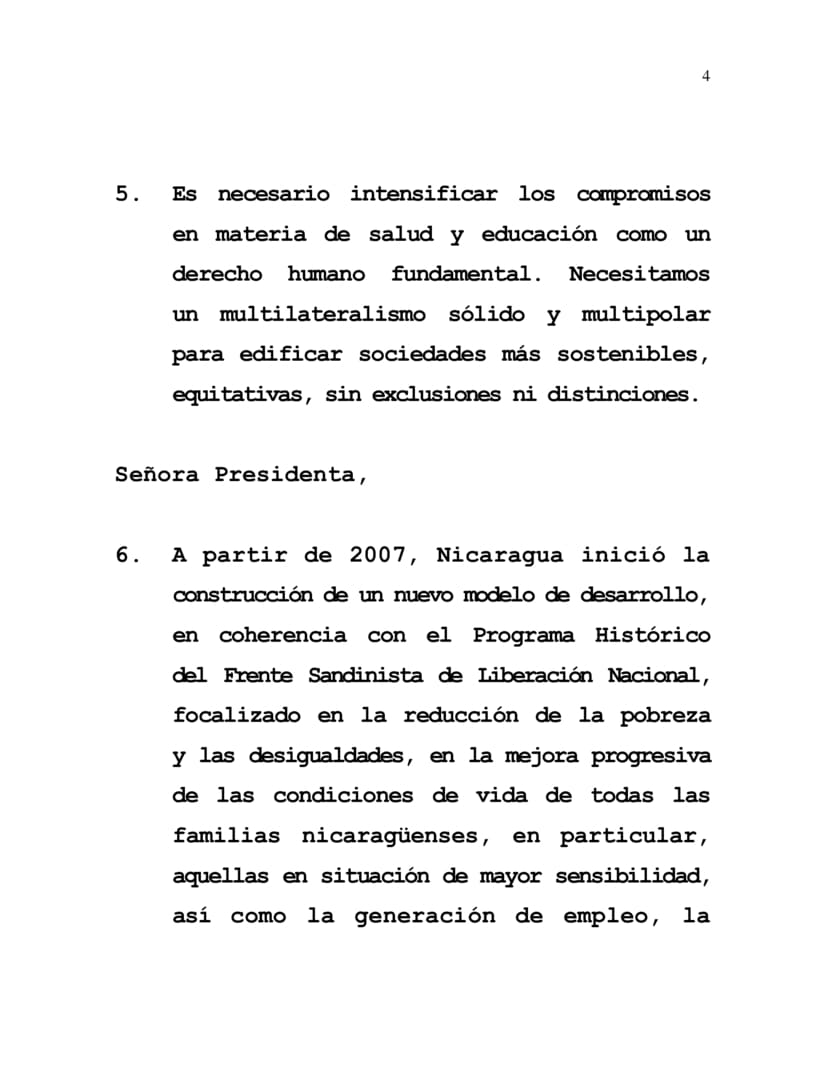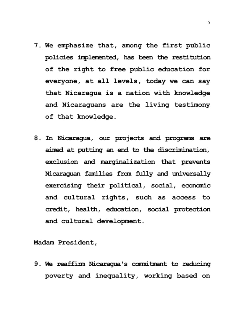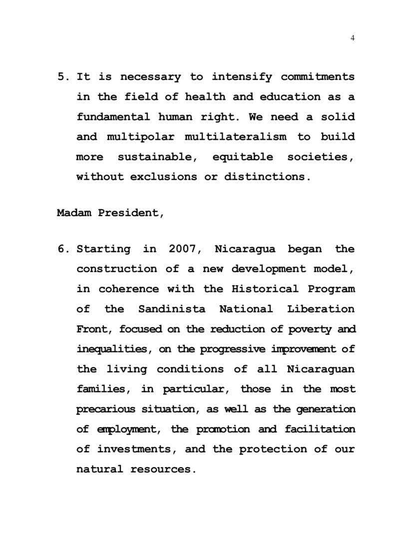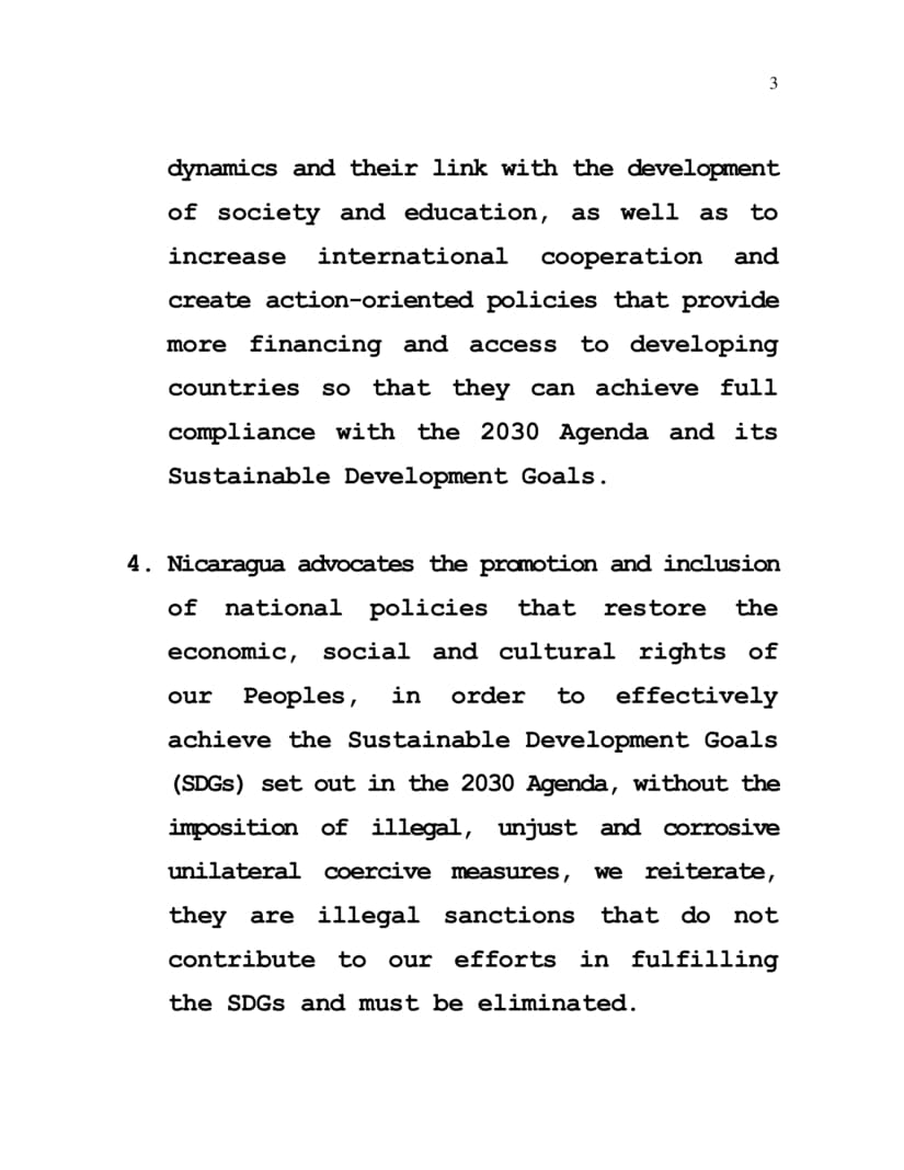 4. Nicaragua advocates the promotion and inclusion of national policies that restore the economic, social and cultural rights of our Peoples, in order to effectively achieve the Sustainable Development Goals (SDGs) set out in the 2030 Agenda, without the imposition of illegal, unjust and corrosive unilateral coercive measures, we reiterate, they are illegal sanctions that do not contribute to our efforts in fulfilling the SDGs and must be eliminated.