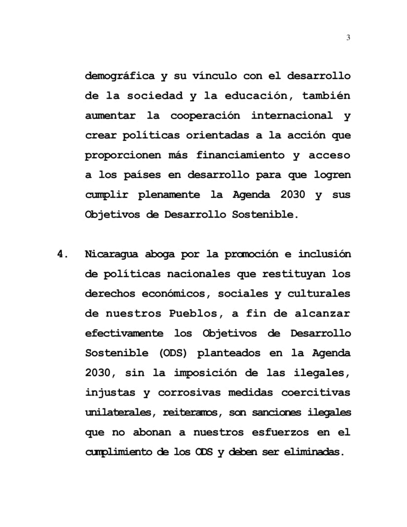 4. Nicaragua aboga por la promoción e inclusión de políticas nacionales que restituyan los derechos económicos, sociales y culturales de nuestros Pueblos, a fin de alcanzar efectivamente los Objetivos de Desarrollo Sostenible (ODS) planteados en la Agenda 2030, sin la imposición de las ilegales, injustas y corrosivas medidas coercitivas unilaterales, reiteramos, son sanciones ilegales que no abonan a nuestros esfuerzos en el cumplimiento de los ODS y deben ser eliminadas.