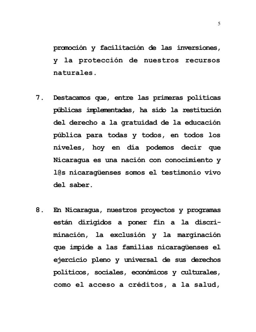 7. We emphasize that, among the first public policies implemented, has been the restitution of the right to free public education for everyone, at all levels, today we can say that Nicaragua is a nation with knowledge and Nicaraguans are the living testimony of that knowledge.