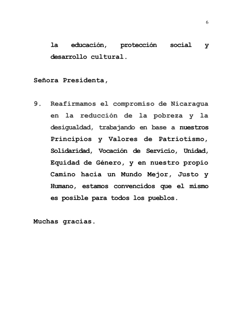 9. Reafirmamos el compromiso de Nicaragua en la reducción de la pobreza y la desigualdad, trabajando en base a nuestros Principios y Valores de Patriotismo, Solidaridad, Vocación de Servicio, Unidad, Equidad de Género, y en nuestro propio Camino hacia un Mundo Mejor, Justo y Humano, estamos convencidos que el mismo es posible para todos los pueblos.