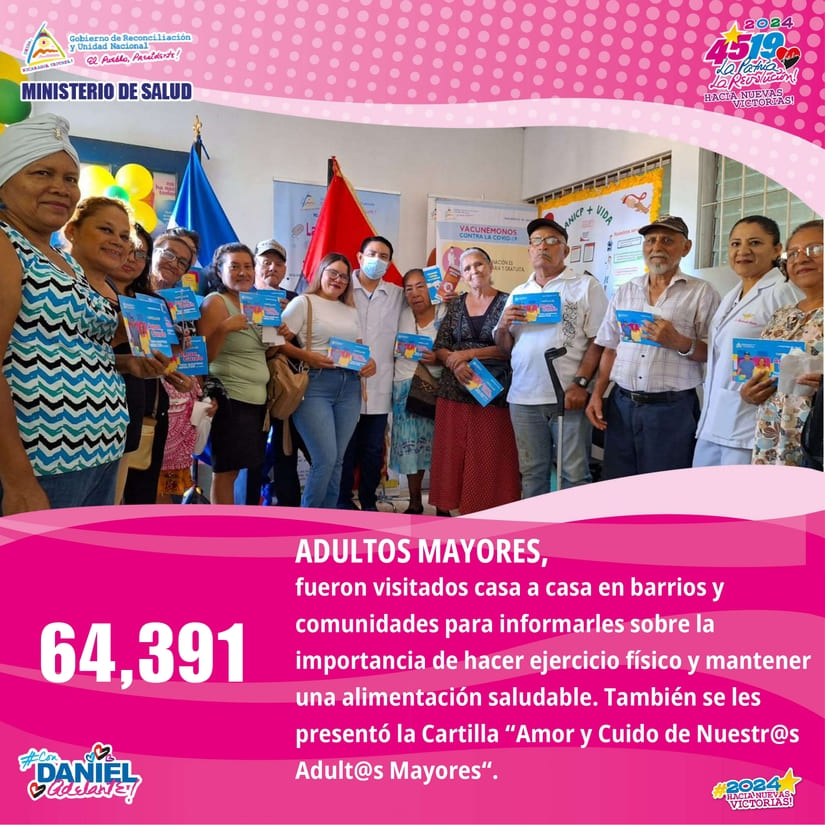 • 64,391 Adult@s Mayores visitados en sus casas en Barrios y Comunidades, para informarles sobre la importancia de hacer ejercicio físico y mantener una alimentación saludable. Además, se les presentó la Cartilla “Amor y Cuido de Nuestr@s Adult@s Mayores”.