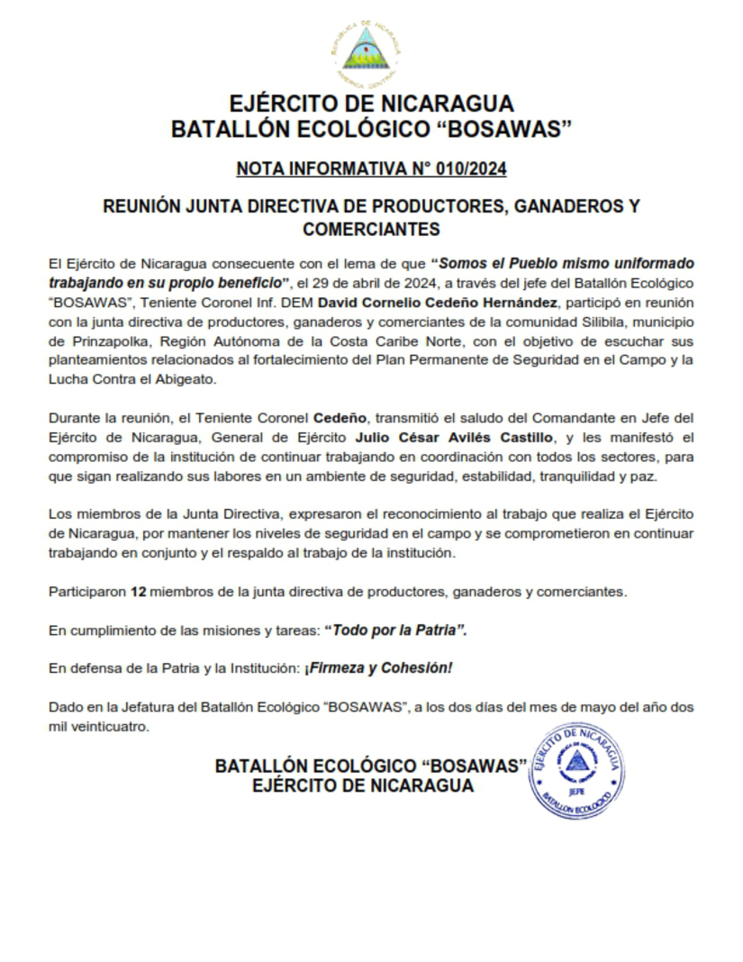 El Ejército de Nicaragua consecuente con el lema de que “Somos el Pueblo mismo uniformado trabajando en su propio beneficio”, el 29 de abril de 2024, a través del jefe del Batallón Ecológico “BOSAWAS”, Teniente Coronel Inf. DEM David Cornelio Cedeño Hernández, participó en reunión con la junta directiva de productores, ganaderos y comerciantes de la comunidad Silibila, municipio de Prinzapolka, Región Autónoma de la Costa Caribe Norte, con el objetivo de escuchar sus planteamientos relacionados al fortalecimiento del Plan Permanente de Seguridad en el Campo y la Lucha Contra el Abigeato.