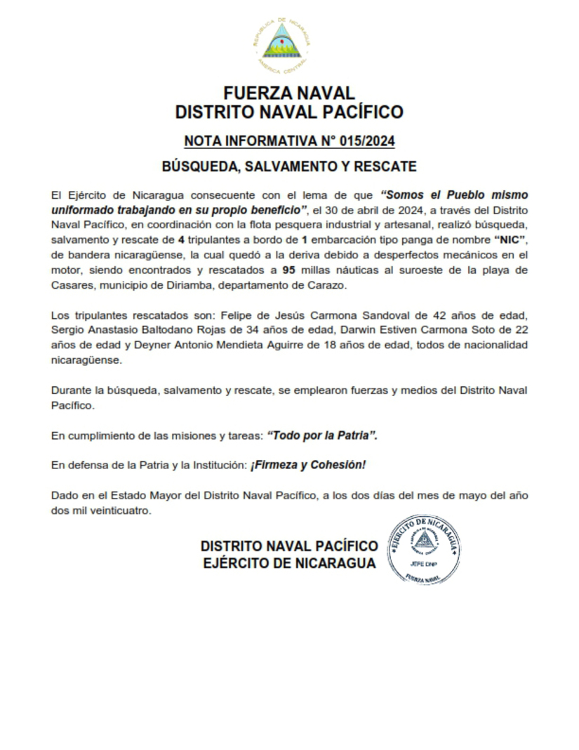 El Ejército de Nicaragua consecuente con el lema de que “Somos el Pueblo mismo uniformado trabajando en su propio beneficio”, el 30 de abril de 2024, a través del Distrito Naval Pacífico, en coordinación con la flota pesquera industrial y artesanal, realizó búsqueda, salvamento y rescate de 4 tripulantes a bordo de 1 embarcación tipo panga de nombre “NIC”, de bandera nicaragüense, la cual quedó a la deriva debido a desperfectos mecánicos en el motor, siendo encontrados y rescatados a 95 millas náuticas al suroeste de la playa de Casares, municipio de Diriamba, departamento de Carazo.