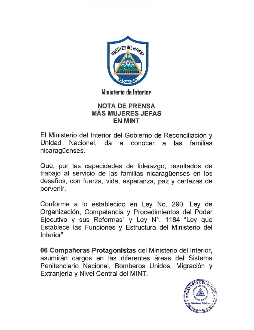 El Ministerio del Interior del Gobierno de Reconciliación y Unidad Nacional, da a conocer a las familias nicaragüenses.