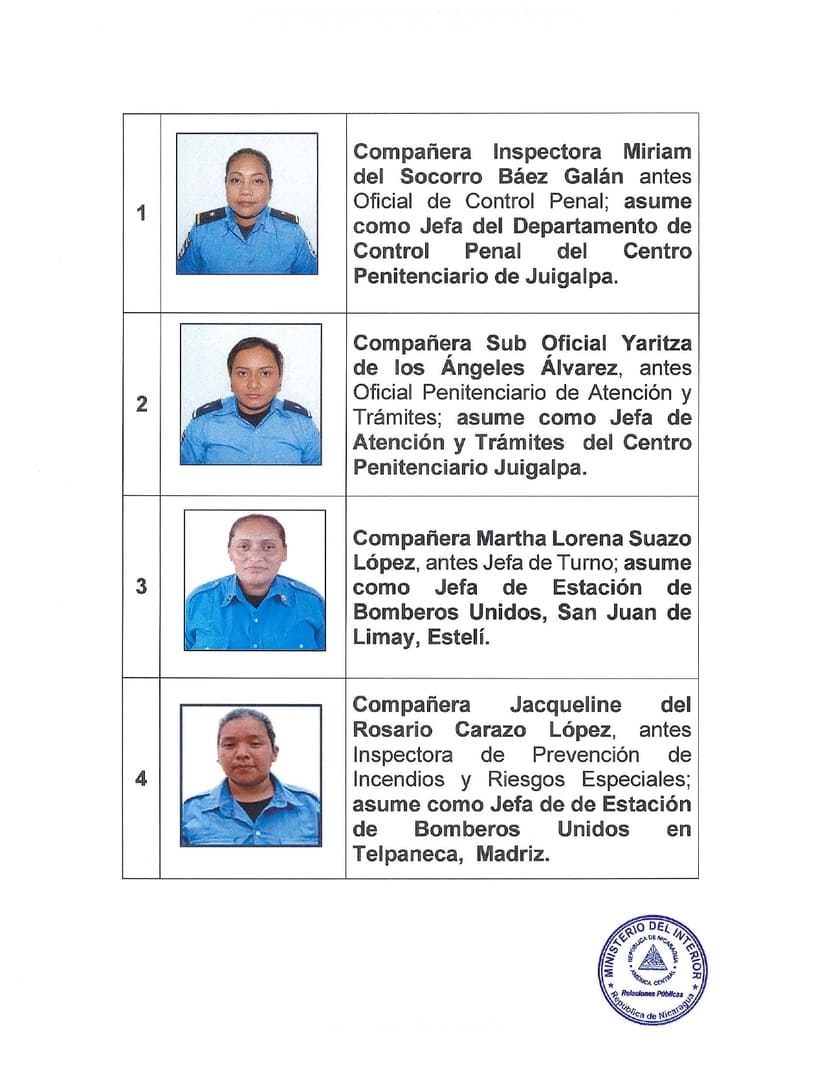 1. Compañera Inspectora Miriam del Socorro Báez Galán antes Oficial de Control Penal; asume como Jefa del Departamento de Control Penal del Centro Penitenciario de Juigalpa.