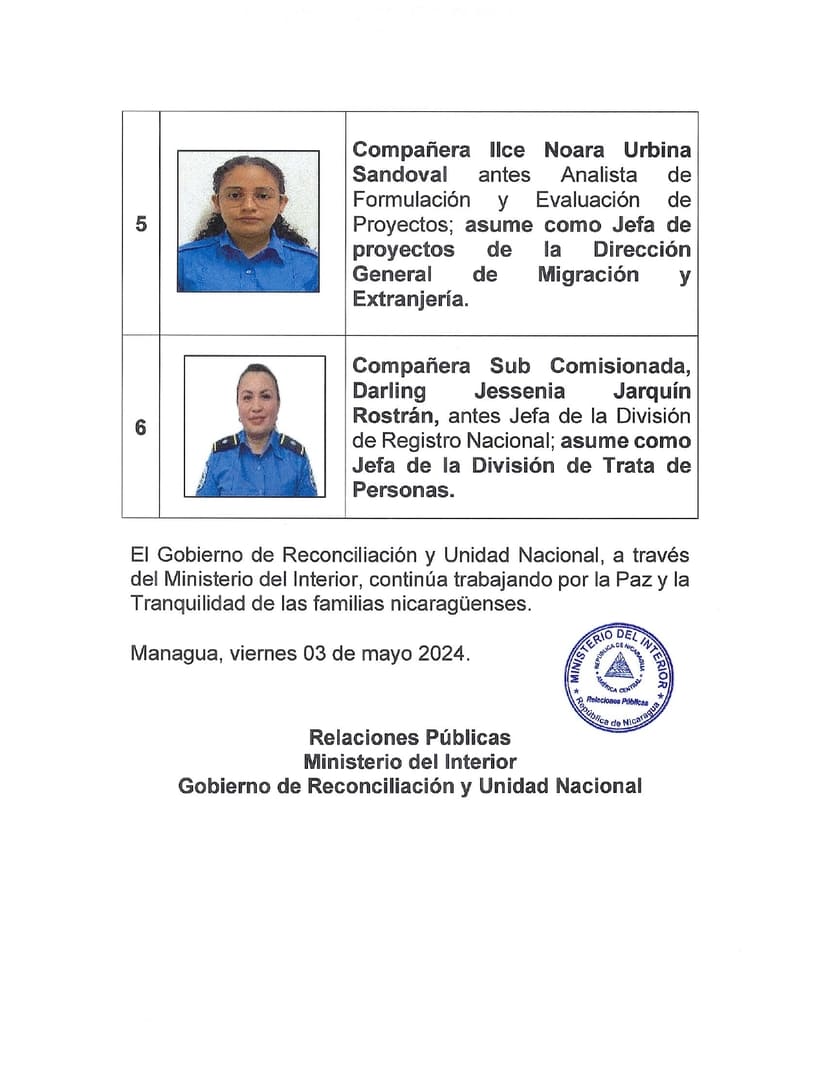 6. Compañera Sub Comisionada, Darling Jessenia Jarquín Rostrán, antes Jefa de la División de Registro Nacional; asume como Jefa de la División de Trata de Personas.
