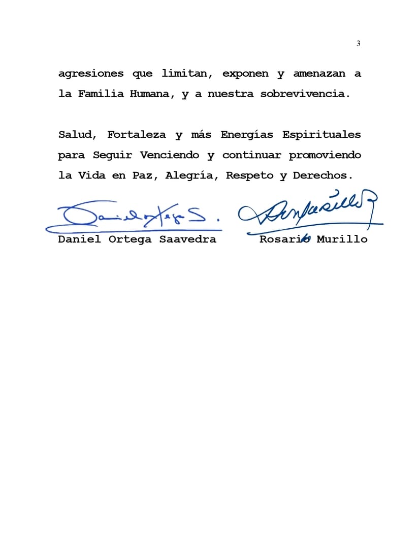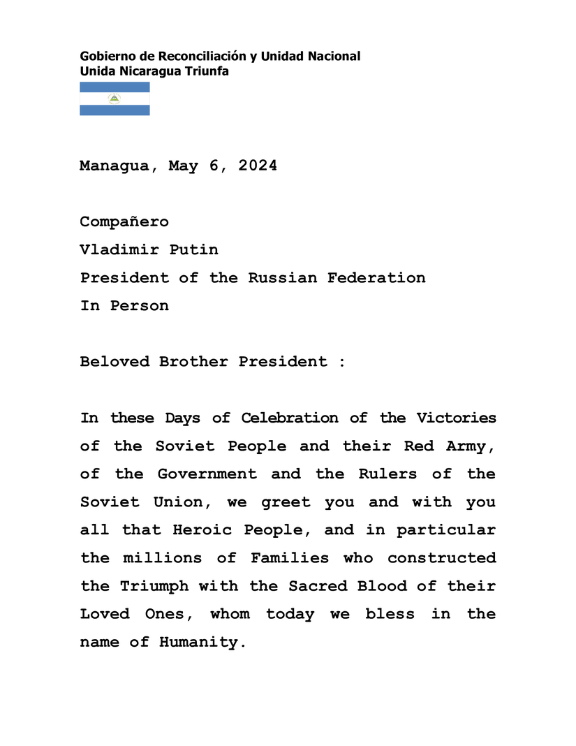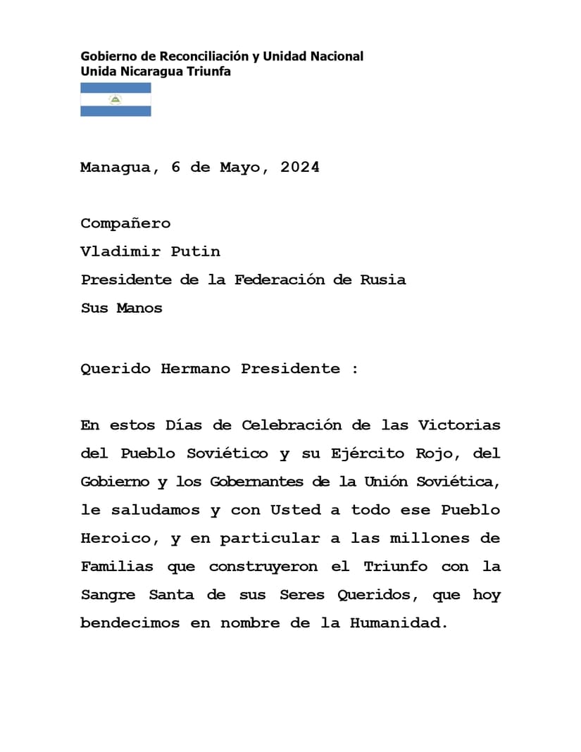 En este sentido, la Vicepresidenta Compañera Rosario Murillo, en su comunicación de mediodía se refirió al mensaje enviado al Presidente Putin, "hablando compañeros, compañeras de la derrota del fascismo, del nazismo, en la Gran Guerra Patria, esa magna victoria del pueblo de la Unión Soviética, más de 20 millones de familia que perdieron sus seres queridos. ¡Sangre Santa! decimos nosotros, que agradecemos y bendecimos en nombre de la humanidad, hemos escrito un mensaje al compañero Presidente Vladimir Putin, quien mañana además se instala para su nuevo periodo de gobierno, luego de las elecciones que le dieron un mandato claro, con unos porcentajes magníficos para proseguir las luchas por el bienestar del pueblo de la Federación de Rusia, y la lucha por un mundo distinto, un mundo de paz. La lucha heroica que libra la Federación de Rusia, que ha librado también a través de los tiempos, y le saludamos en este día".
