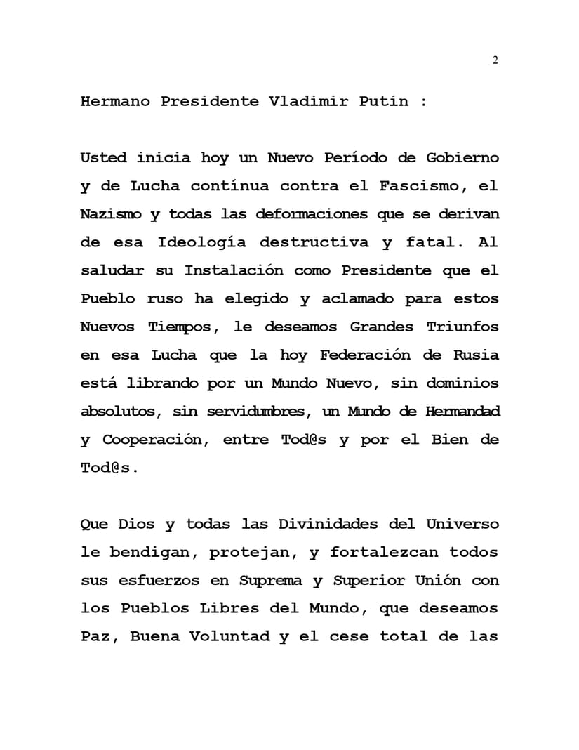 Usted inicia hoy un Nuevo Período de Gobierno y de Lucha continua contra el Fascismo, el Nazismo y todas las deformaciones que se derivan de esa Ideología destructiva y fatal. Al saludar su Instalación como Presidente que el Pueblo ruso ha elegido y aclamado para estos Nuevos Tiempos, le deseamos Grandes Triunfos en esa Lucha que la hoy Federación de Rusia está librando por un Mundo Nuevo, sin dominios absolutos, sin servidumbres, un Mundo de Hermandad y Cooperación, entre Tod@s y por el Bien de Tod@s.