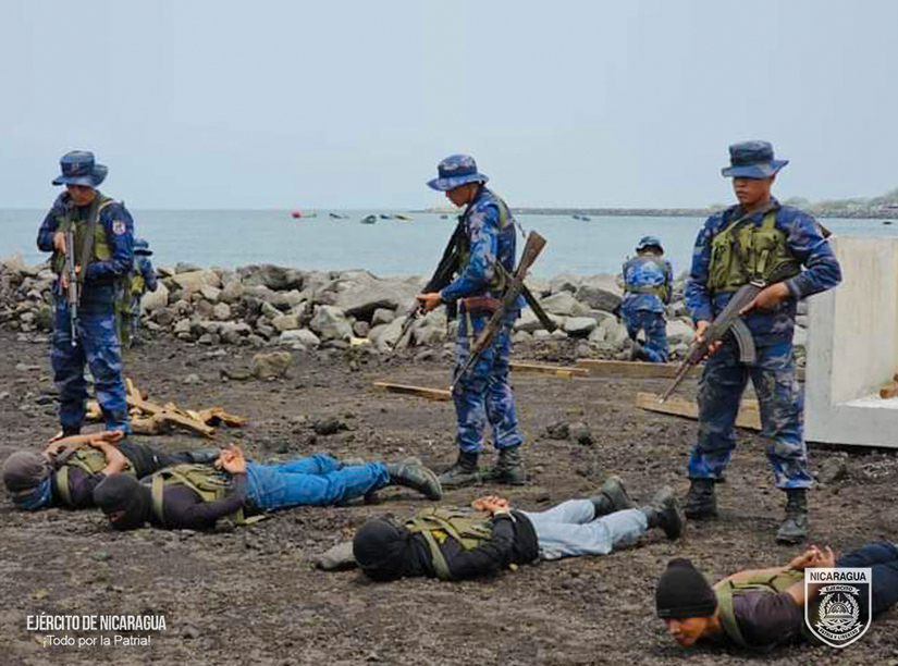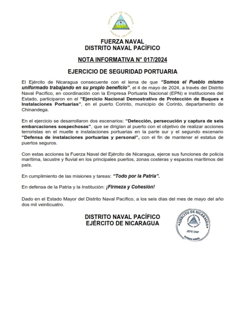 El Ejército de Nicaragua consecuente con el lema de que “Somos el Pueblo mismo uniformado trabajando en su propio beneficio”, el 4 de mayo de 2024, a través del Distrito Naval Pacífico, en coordinación con la Empresa Portuaria Nacional (EPN) e instituciones del Estado, participaron en el “Ejercicio Nacional Demostrativo de Protección de Buques e Instalaciones Portuarias”, en el puerto Corinto, municipio de Corinto, departamento de Chinandega.