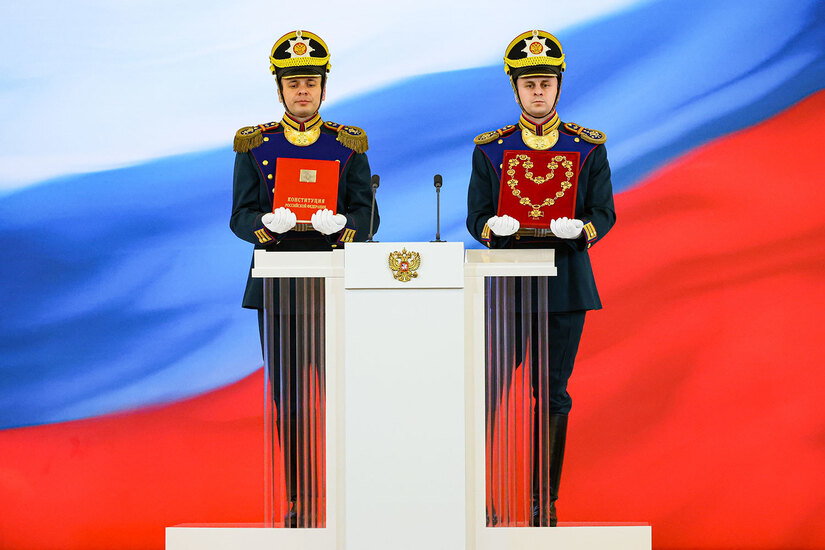 El acto comenzó con la introducción ceremonial de la Bandera Estatal de Rusia, el Estandarte del Presidente, la Constitución de Rusia y la Insignia del Presidente de Rusia en el Salón de San Andrés del Gran Palacio del Kremlin.