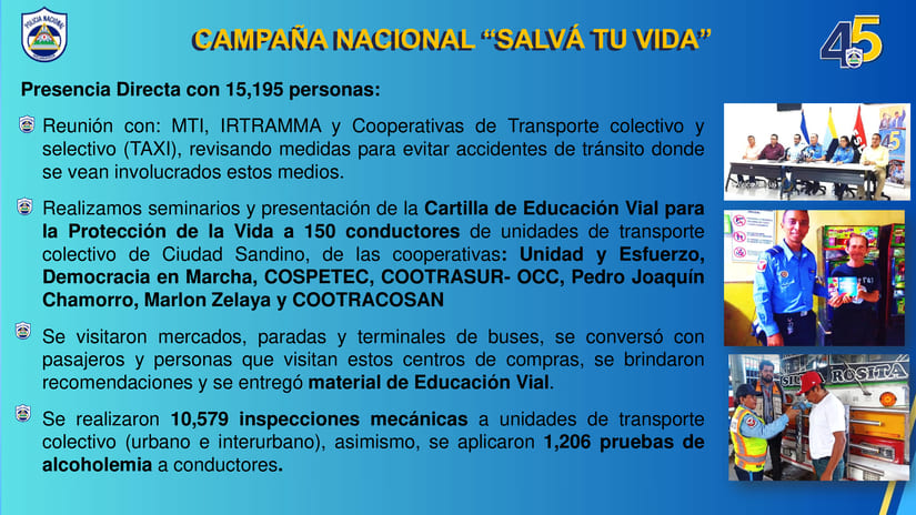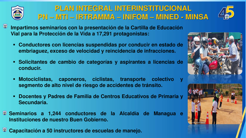 Dentro del Plan Interinstitucional integrado por el MTI, Policía Nacional, Irtramma, Inifom, Mined y Minsa, se impartieron seminarios y la Cartilla de Educación Vial a 17 mil 291 protagonistas, entre ellos, motociclistas, caponeros, ciclistas, transporte colectivo, conductores con licencias suspendidas, así como solicitantes de cambio de categoría y aspirantes a licencias de conducir, entre otros.