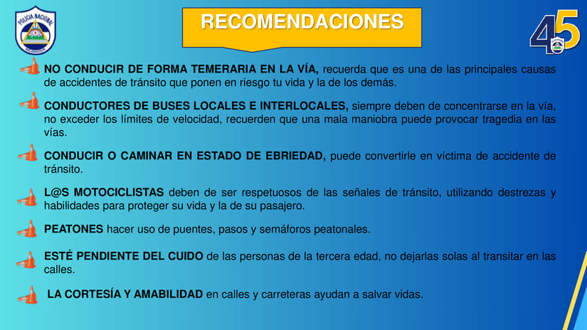 El Comisionado General Jaime Vanegas, Inspector General de la Policía, indicó que también se impartió seminarios a 1 mil 244 conductores de la Alcaldía de Managua e instituciones del Buen Gobierno y 50 instructores de escuelas de manejo.