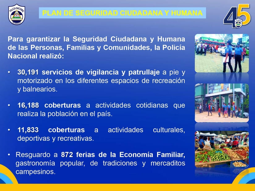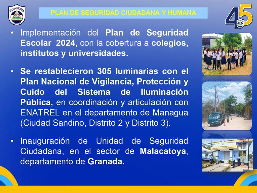 Agregó en el informe que también se llevó a cabo un plan de seguridad escolar con cobertura a colegios, institutos y universidades. Se restablecieron 305 luminarias en Ciudad Sandino y los distritos II y III de Managua.