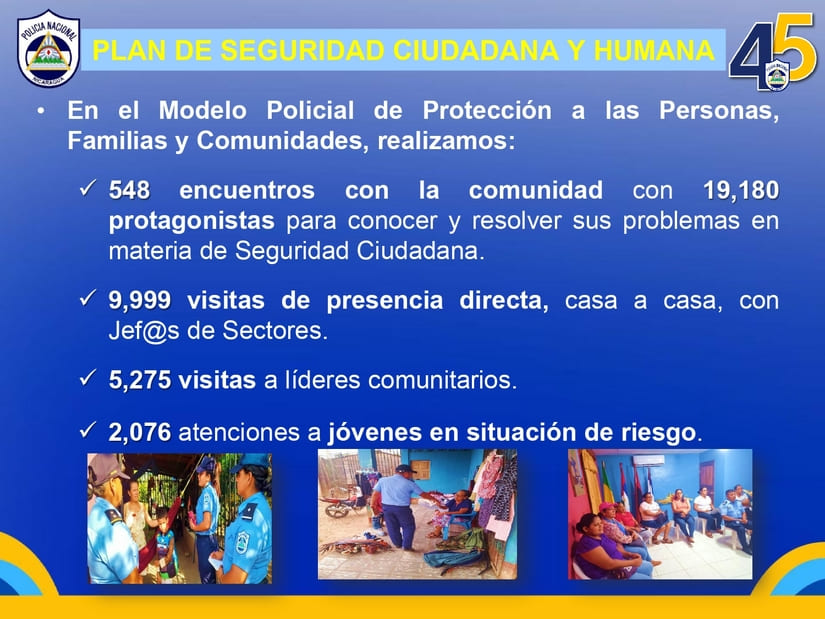 La institución policial también desarrolló 548 encuentros con las comunidades en la que participaron 19 mil 180 protagonistas, 9 mil 999 visitas de presencia directa casa a casa, 5 mil 275 visitas a líderes comunitarios.