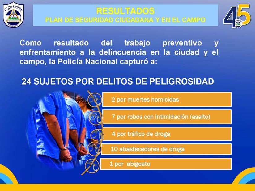 En las acciones llevadas a cabo en el período señalado, se detuvieron a 24 sujetos autores de delitos de peligrosidad, entre ellos 2 por muertes homicidas, 7 por robos, 4 por tráfico de drogas, 10 abastecedores de estupefacientes y 1 por abigeato.