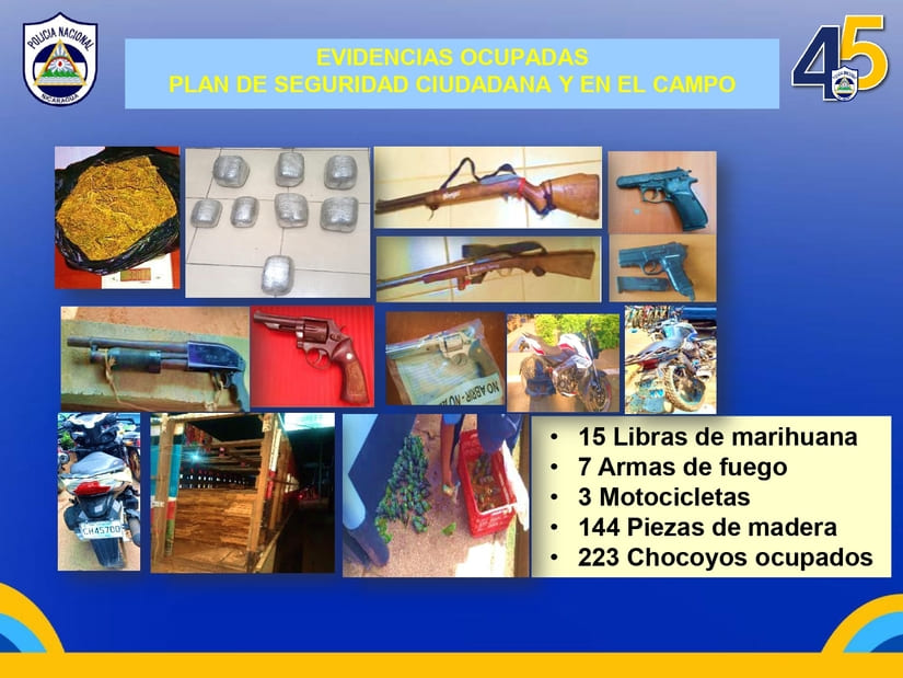 Se ocuparon 15 libras de “Cannabis sativa”, 7 armas de fuego, 3 motocicletas, 144 piezas de madera y 233 chocoyos.