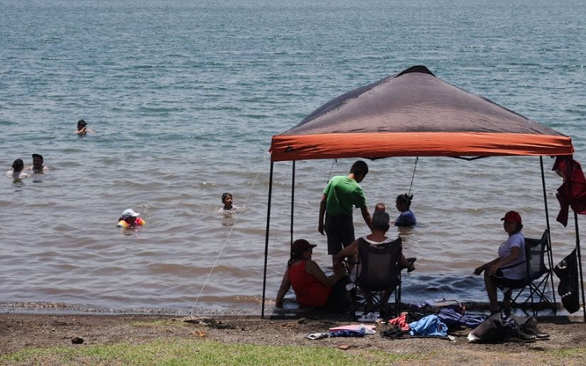 Una familia que llegó a Xiloá llevó su propio toldo y lo instaló dentro de la costa y colocaron varios asientos donde disfrutaron las aguas bajo la sombra durante la mañana de este domingo.