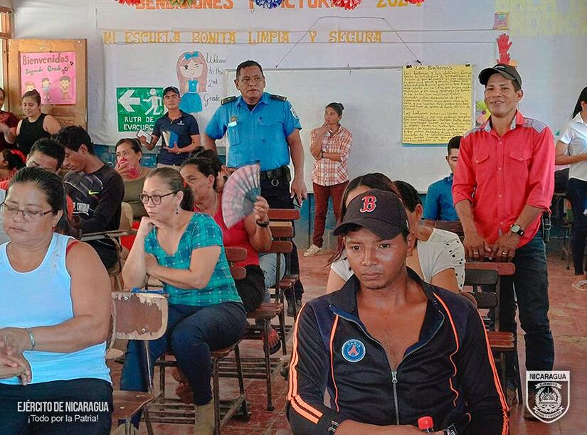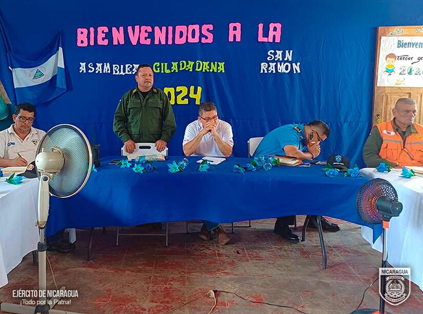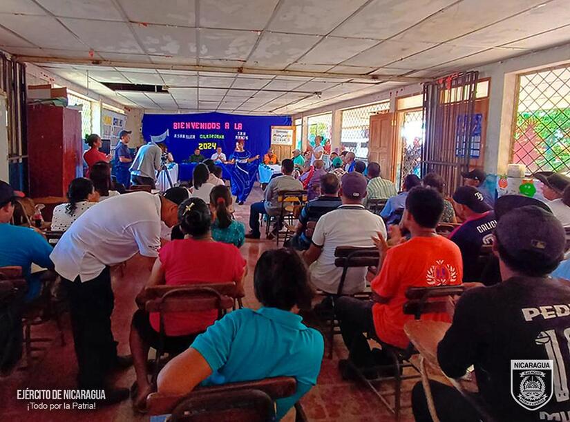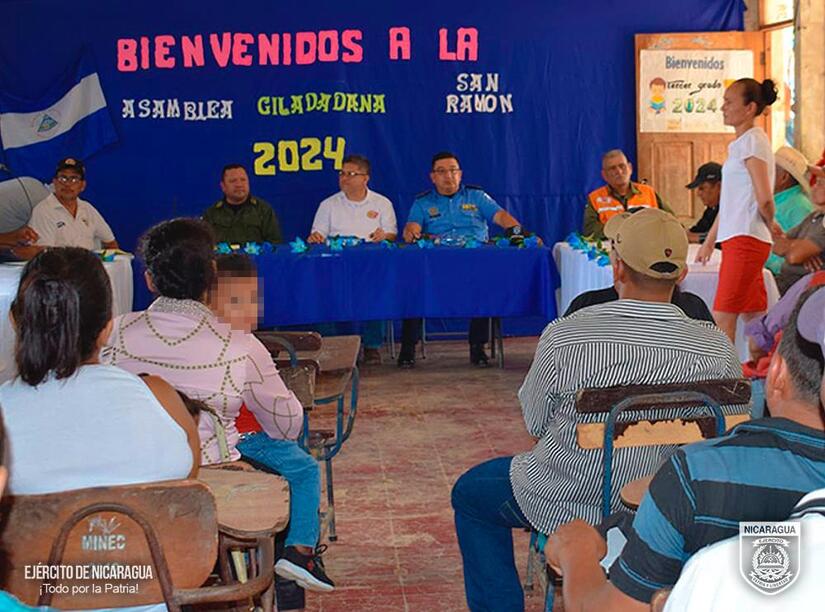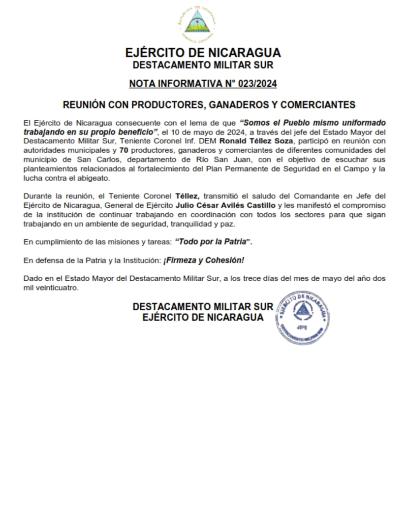 El Ejército de Nicaragua consecuente con el lema de que "Somos el Pueblo mismo uniformado trabajando en su propio beneficio", el 10 de mayo de 2024, a través del jefe del Estado Mayor del Destacamento Militar Sur, Teniente Coronel Inf. DEM Ronald Téllez Soza, participó en reunión con autoridades municipales y 70 productores, ganaderos y comerciantes de diferentes comunidades del municipio de San Carlos, departamento de Río San Juan, con el objetivo de escuchar sus planteamientos relacionados al fortalecimiento del Plan Permanente de Seguridad en el Campo y la lucha contra el abigeato.