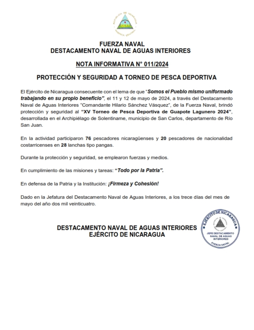 El Ejército de Nicaragua consecuente con el lema de que "Somos el Pueblo mismo uniformado trabajando en su propio beneficio", el 11 y 12 de mayo de 2024, a través del Destacamento Naval de Aguas Interiores "Comandante Hilario Sánchez Vásquez", de la Fuerza Naval, brindó protección y seguridad al "XV Torneo de Pesca Deportiva de Guapote Lagunero 2024", desarrollada en el Archipiélago de Solentiname, municipio de San Carlos, departamento de Rio San Juan.