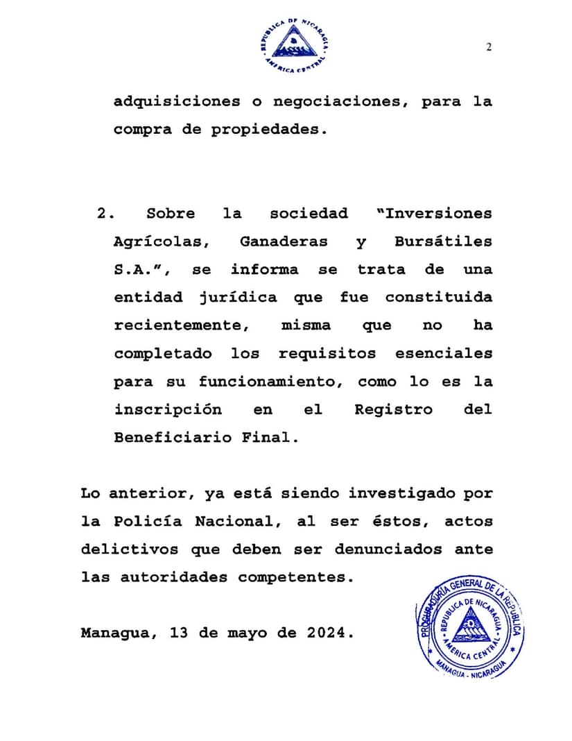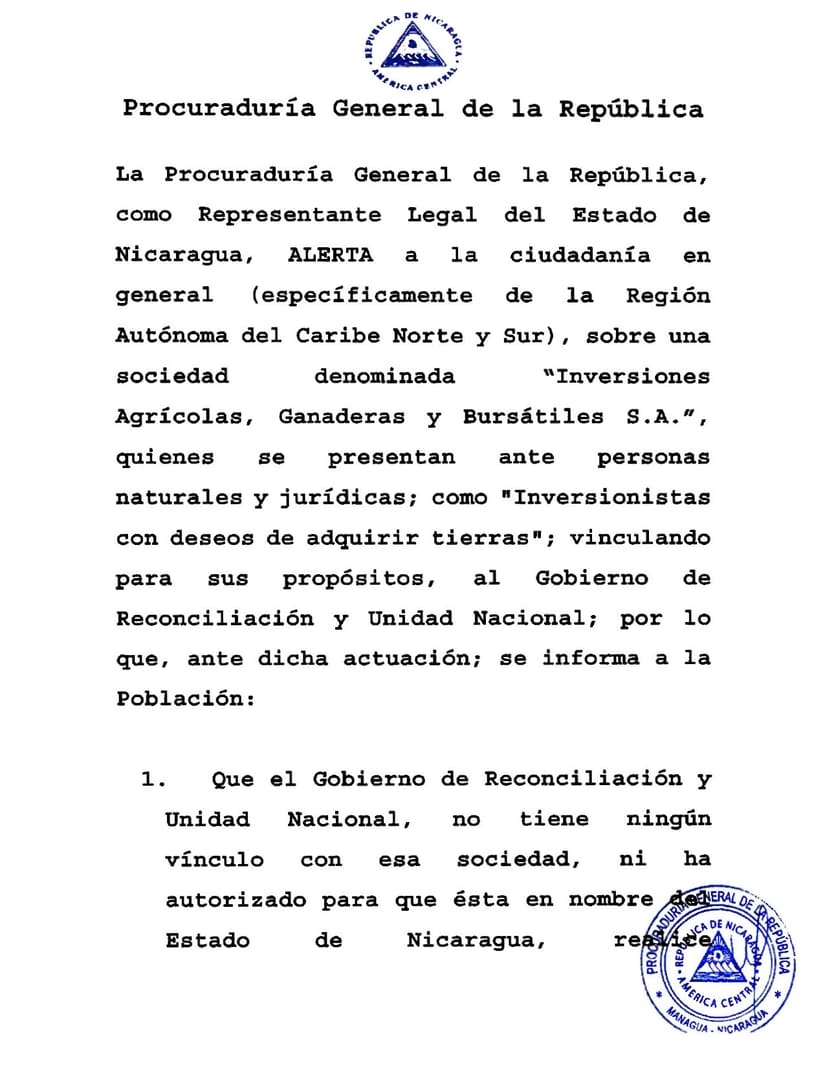 Nota de Prensa de la Procuraduría General de la República sobre posibles fraudes de la Sociedad denominada “Inversiones Agrícolas, Ganaderas y Bursátiles S.A.”, en las Regiones Autónomas de la Costa Caribe Norte y Sur.