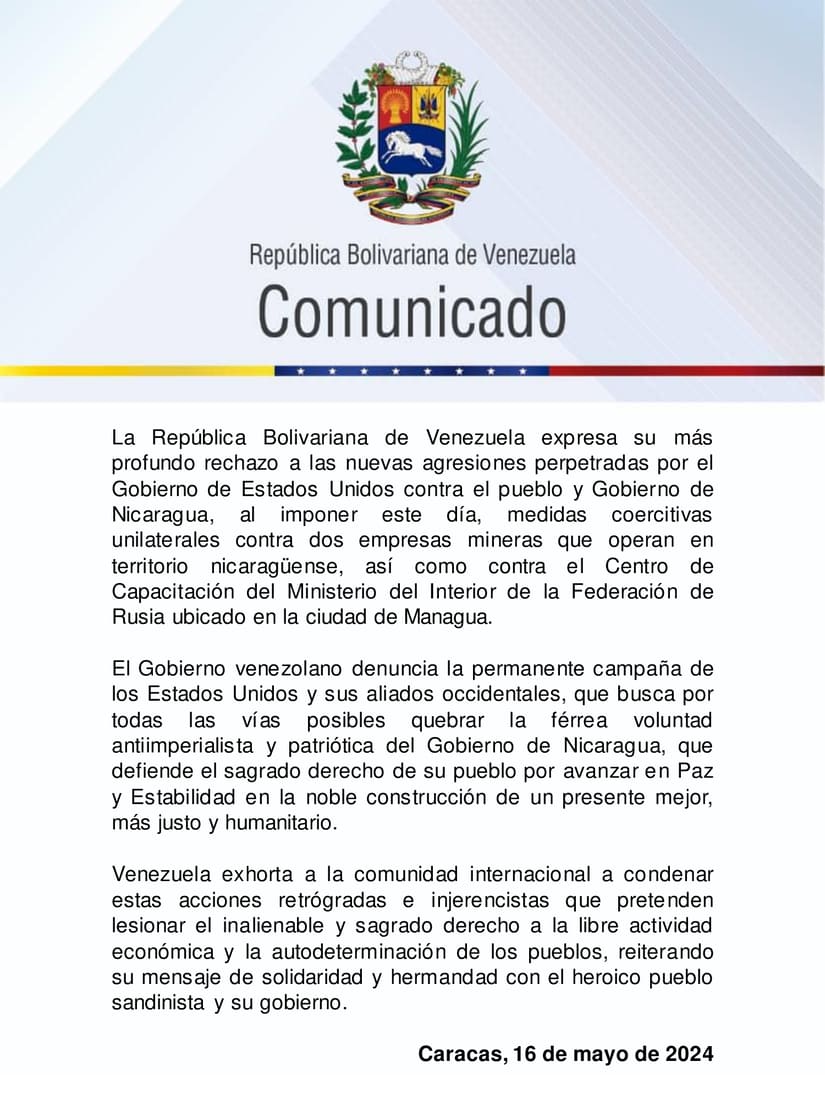 La República Bolivariana de Venezuela expresa su más profundo rechazo a las nuevas agresiones perpetradas por el Gobierno de Estados Unidos contra el pueblo y Gobierno de Nicaragua, al imponer este día, medidas medidas coercitivas unilaterales contra dos empresas mineras que operan en territorio nicaragüense, así contra el Centro de Capacitación del Ministerio del Interior de la Federación de Rusia ubicado en la ciudad de Managua.