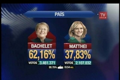 Por segunda vez y después de cuatro años, la abandera de la Nueva Mayoría, Michelle Bachelet se convierte nuevamente en presidenta de Chile, tras vencer este domingo en una segunda vuelta a la candidata oficialista Evelyn Matthei con 3 millones 468 mil 075 votos lo que representa un valor porcentual de 62,16 por ciento de los votos válidos emitidos en un 99,96 de las mesas escrutadas por el Servicio Electoral chileno.