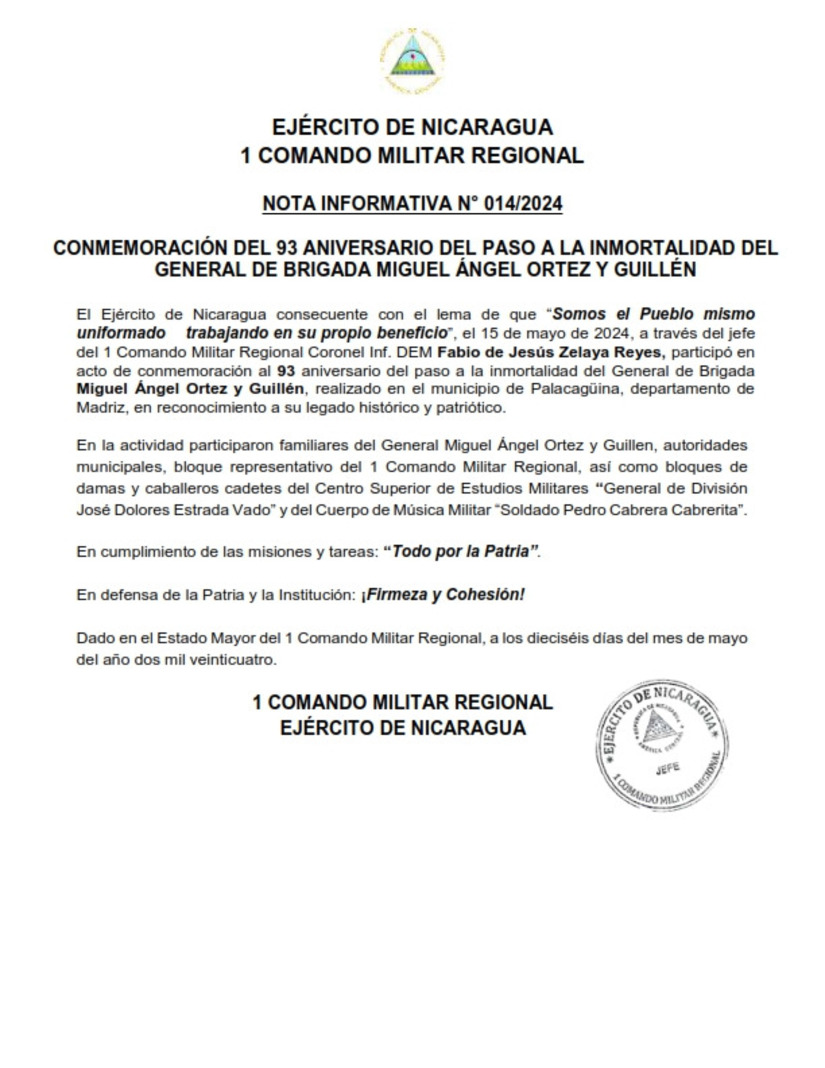 El Ejército de Nicaragua consecuente con el lema de que "Somos el Pueblo mismo uniformado trabajando en su propio beneficio", el 15 de mayo de 2024, a través del jefe del 1 Comando Militar Regional Coronel Inf. DEM Fabio de Jesús Zelaya Reyes, participó en acto de conmemoración al 93 aniversario del paso a la inmortalidad del General de Brigada Miguel Ángel Ortez y Guillén, realizado en el municipio de Palacagüina, departamento de Madriz, en reconocimiento a su legado histórico y patriótico.