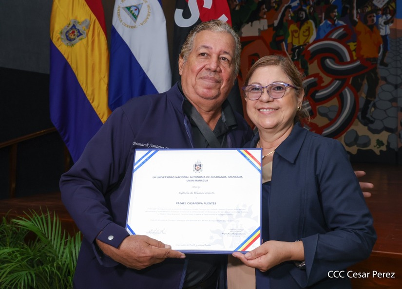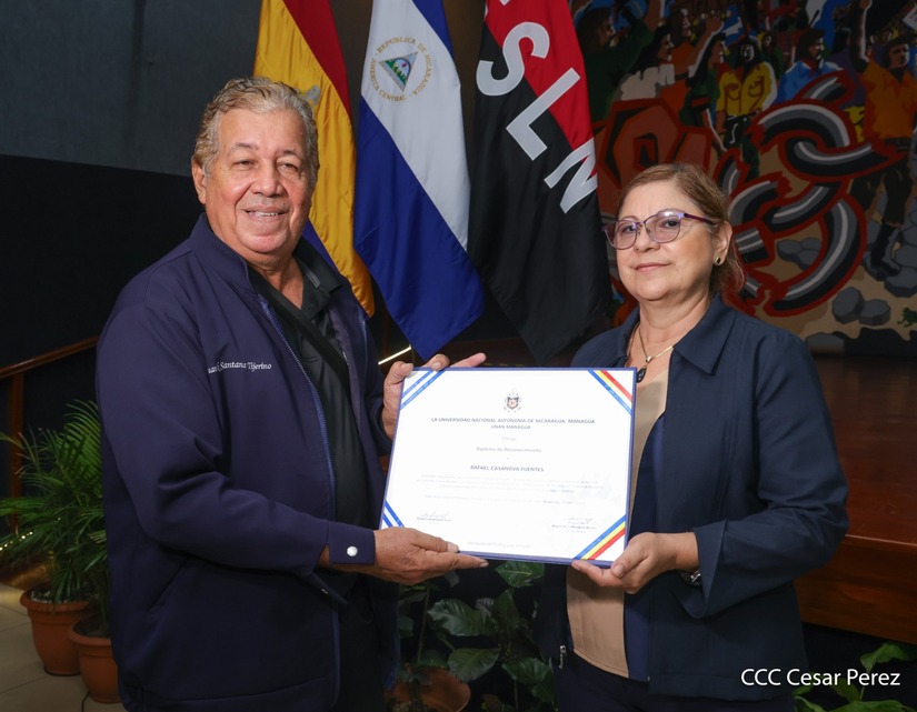 Además, la Rectora de la UNAN-Managua le entregó un reconocimiento por su excelente conferencia sobre Sandino como un aporte al conocimiento de su legado histórico.