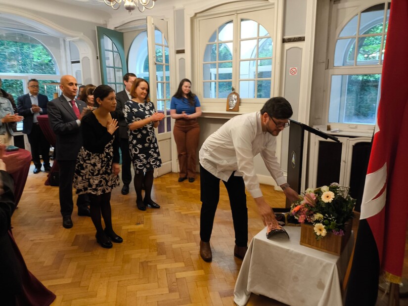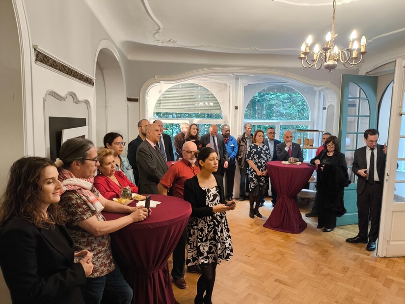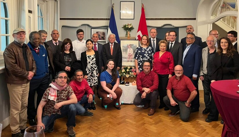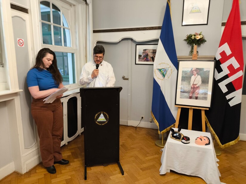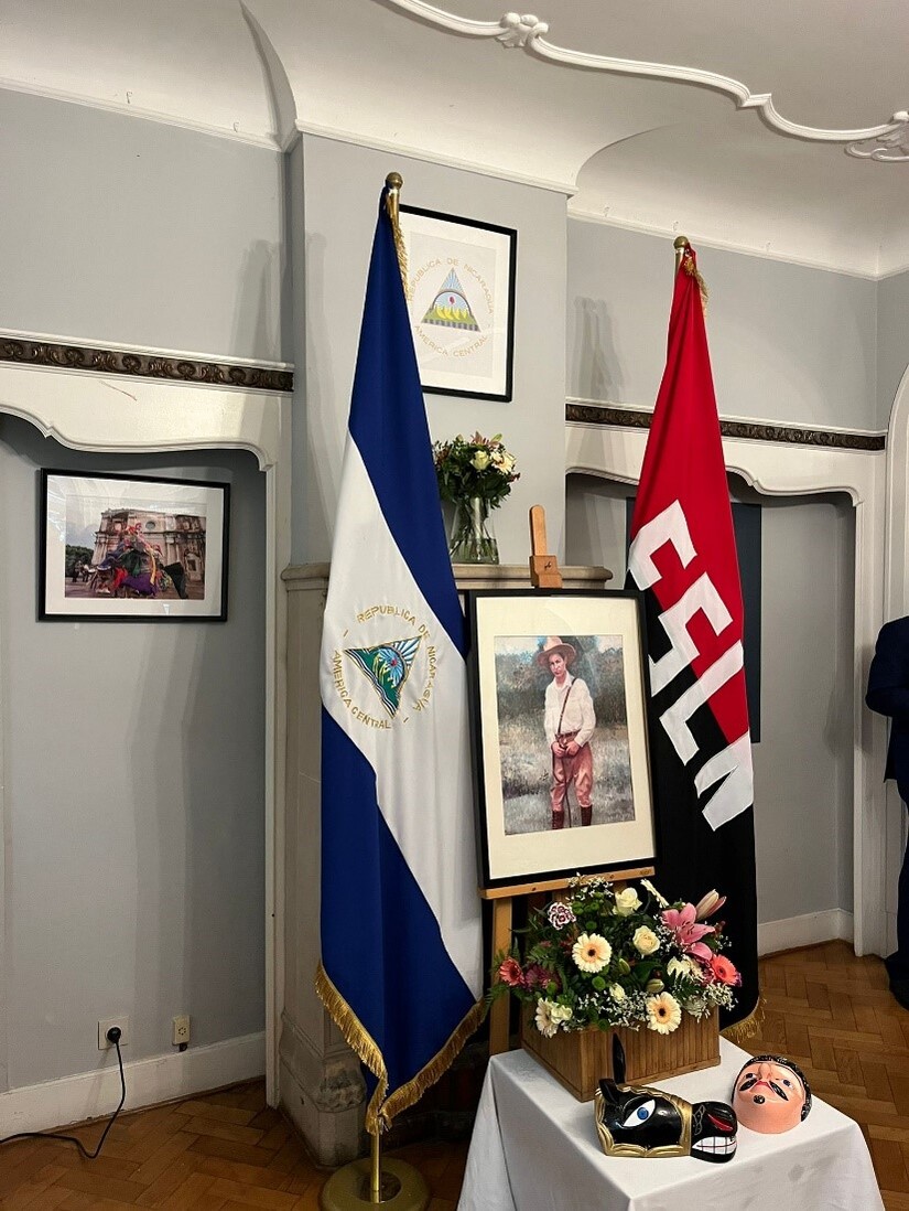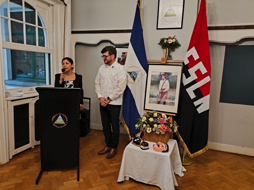 Nuestro Embajador en Bélgica, compañero César Castañeda, después de transmitir los saludos fraternos de nuestro Presidente-Comandante Daniel Ortega y nuestra Vicepresidenta Compañera Rosario Murillo, compartió sobre la importancia para el Pueblo nicaragüense, de reconocer en Sandino ese Sol de Libertad que nos continúa iluminando y guiando por las sendas de la Paz y la Justicia, y nos inspira a no doblegarnos jamás ante las agresiones y presiones extranjeras y mantener firme ese NO a la injerencia imperialista y Neo colonialista, NO a las injusticias y crímenes hacia los pueblos como el genocidio cometido en Palestina. Como parte del Homenaje al Padre de la Soberanía y Dignidad y Nacional, algunos de los presentes recitaron poemas en su honor y se finalizó el acto depositando una ofrenda floral en su retrato.