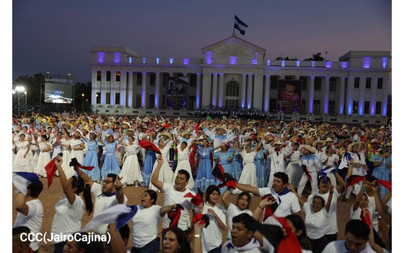 “En esta plaza estamos viendo la representación portentosa del nacimiento y de la boda de nuestro General y de Blanquita y se han presentado y se presentan más de 800 artistas, en este caso, solamente de Managua, porque en todo el país hemos visto y vemos esa fuerza creativa, porque las Casas de Cultura, Creatividad y las Escuelas de Arte, germinan, florecen y cosechamos ese y este talento maravilloso, excepcional de nuestras muchachas y muchachos que celebran en algarabía victoriosa al Padre de la Revolución Popular Sandinista, maestro y guía de nuestros caminos triunfales”, apuntó.