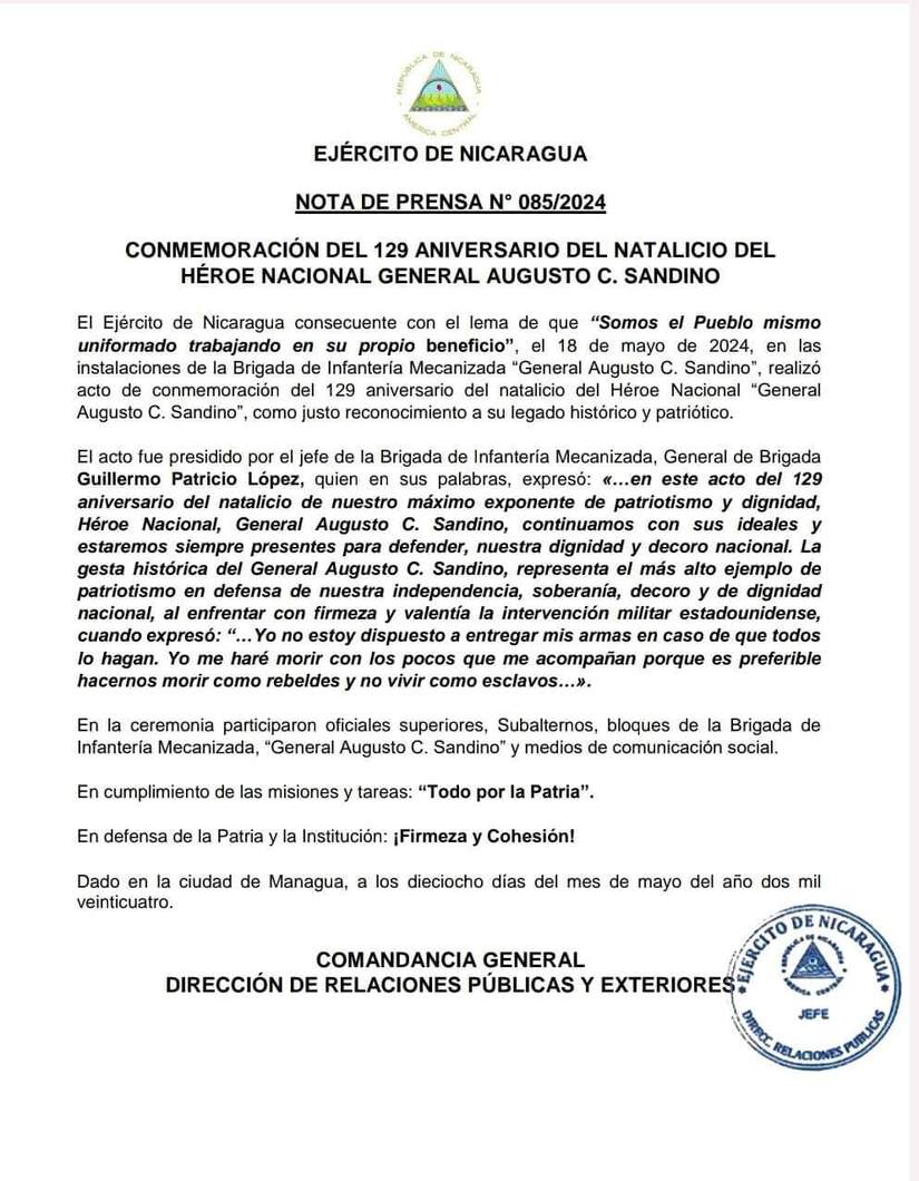 El Ejército de Nicaragua consecuente con el lema de que "Somos el Pueblo mismo uniformado trabajando en su propio beneficio", el 18 de mayo de 2024, en las instalaciones de la Brigada de Infantería Mecanizada "General Augusto C. Sandino", realizó acto de conmemoración del 129 aniversario del natalicio del Héroe Nacional "General Augusto C. Sandino", como justo reconocimiento a su legado histórico y patriótico.