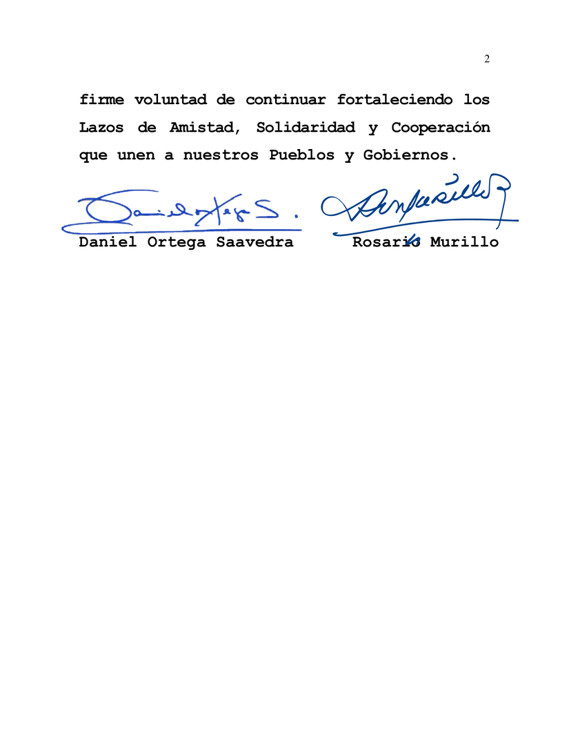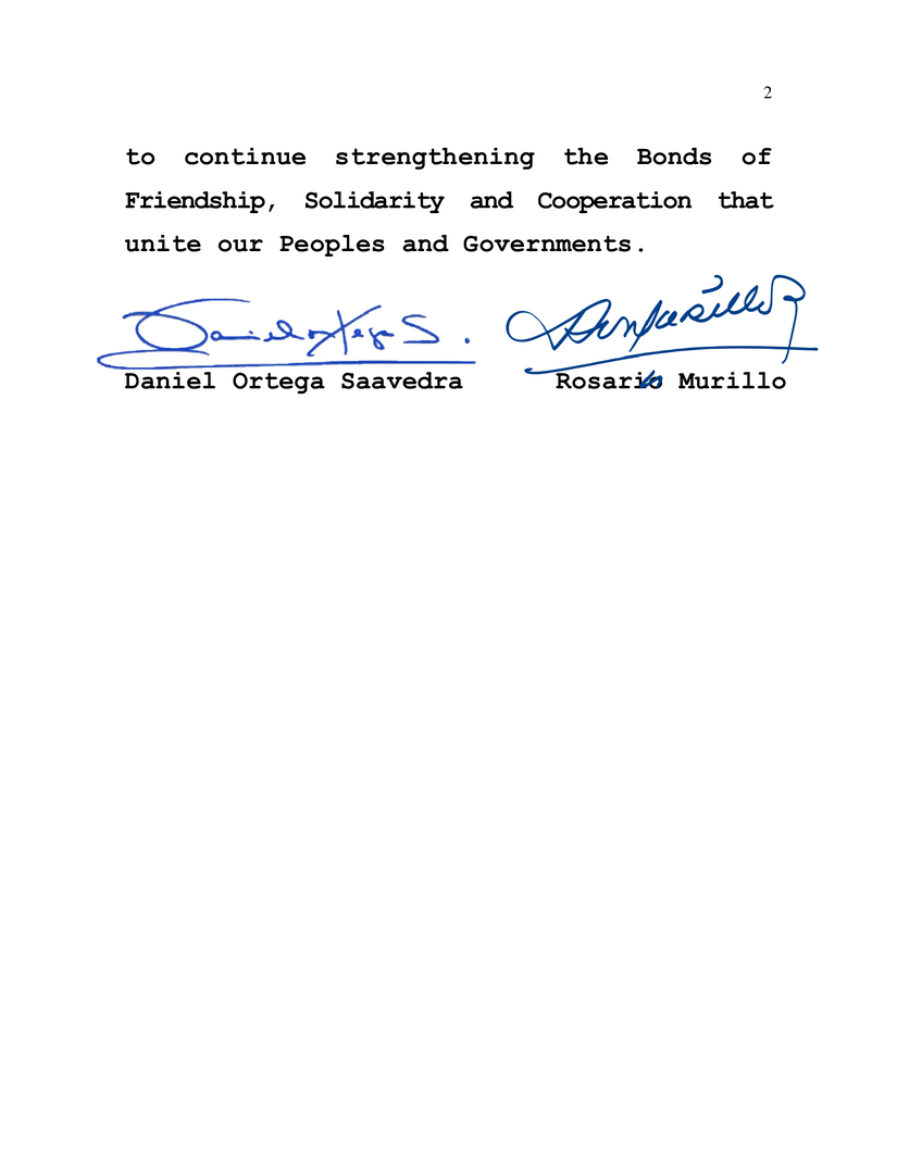 Desde nuestra Nicaragua, Siempre Bendita y Siempre Libre, nos complace reiterar nuestra firme voluntad de continuar fortaleciendo los Lazos de Amistad, Solidaridad y Cooperación que unen a nuestros Pueblos y Gobiernos.