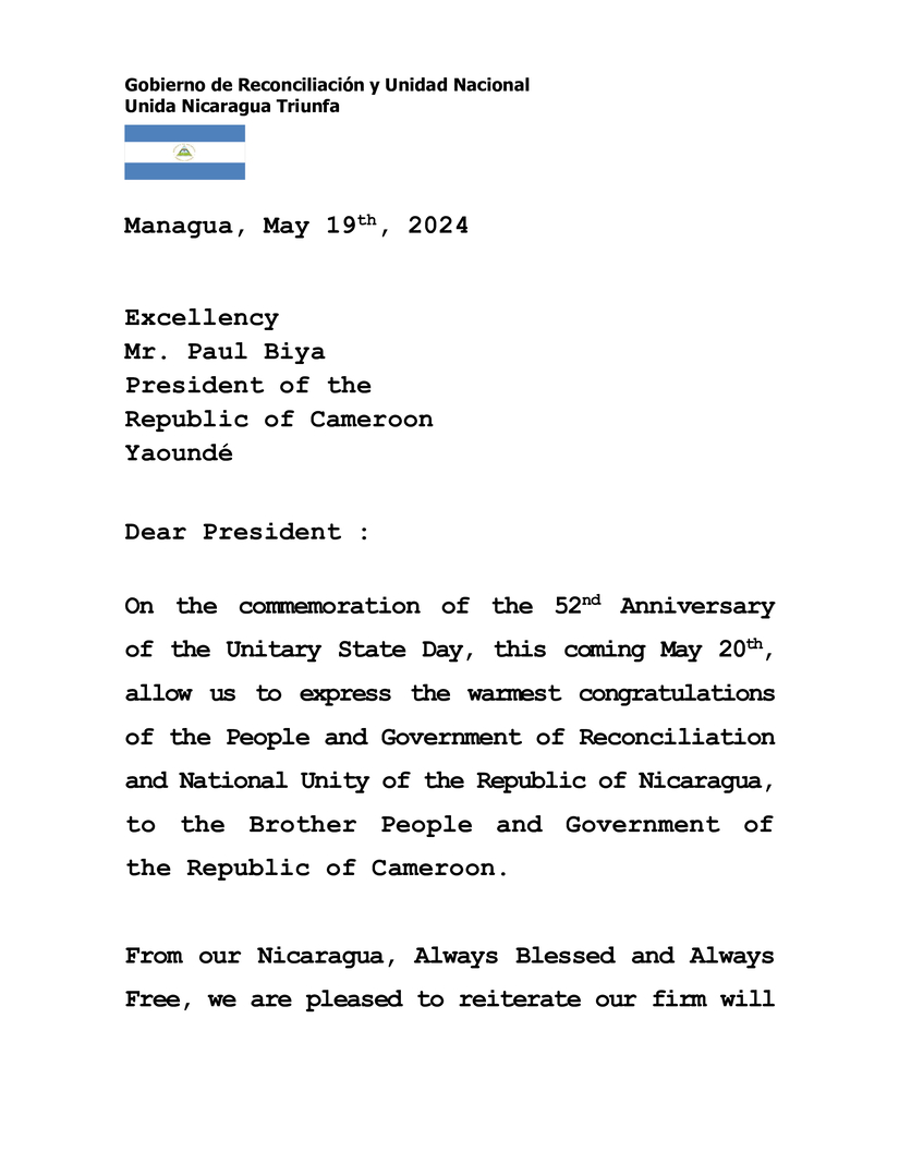 Al conmemorar el 52º Aniversario del Día de la Unificación del Estado, este próximo 20 de Mayo, permítanos expresar las más cálidas felicitaciones del Pueblo y Gobierno de Reconciliación y Unidad Nacional de la República de Nicaragua, al Hermano Pueblo y Gobierno de la República de Camerún.