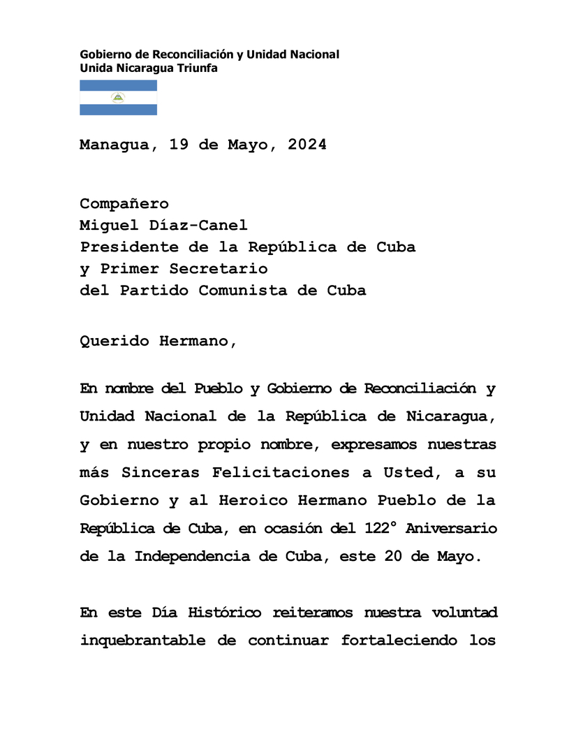 En nombre del Pueblo y Gobierno de Reconciliación y Unidad Nacional de la República de Nicaragua, y en nuestro propio nombre, expresamos nuestras más Sinceras Felicitaciones a Usted, a su Gobierno y al Heroico Hermano Pueblo de la República de Cuba, en ocasión del 122° Aniversario de la Independencia de Cuba, este 20 de Mayo.