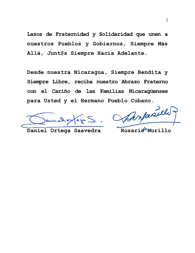 Desde nuestra Nicaragua, Siempre Bendita y Siempre Libre, reciba nuestro Abrazo Fraterno con el Cariño de las Familias Nicaragüenses para Usted y el Hermano Pueblo Cubano.