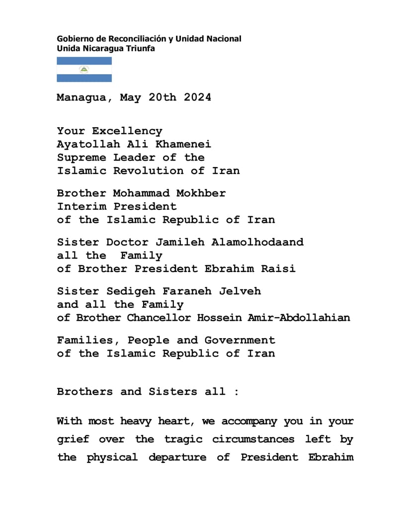La Compañera Vicepresidente Rosario Murillo, en su comunicado de mediodía, se refirió a la triste noticia del fallecimiento del Presidente de Irán, Hermano Ebrahim Raisi, expresando sus condolencias sinceras y profundas.