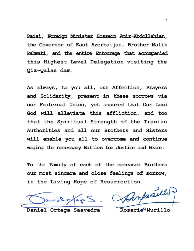 Acompañamos, de Corazón, su dolor en estas trágicas circunstancias que ha dejado la partida física del Presidente Ebrahim Raisi, del Canciller Hossein Amir-Abdollahian, del Gobernador de Azerbaiyán Oriental, Hermano Malik Rahmati, y toda la Comitiva que acompañaba a esta Delegación de Primer Nivel que visitó la represa Qiz-Qalas.