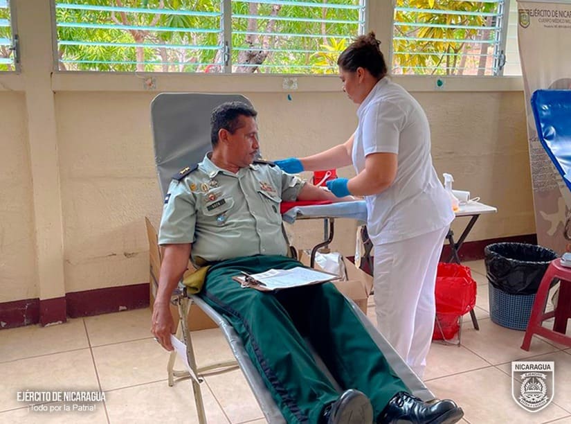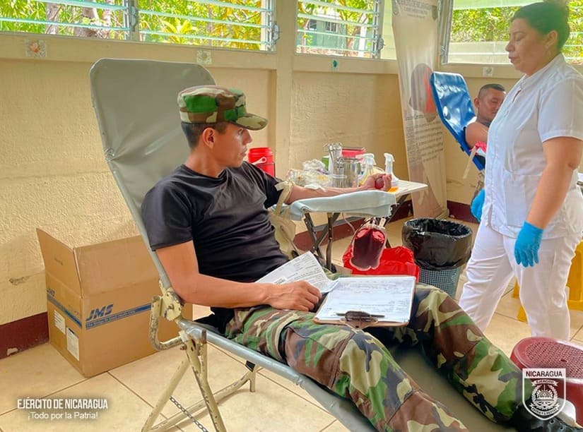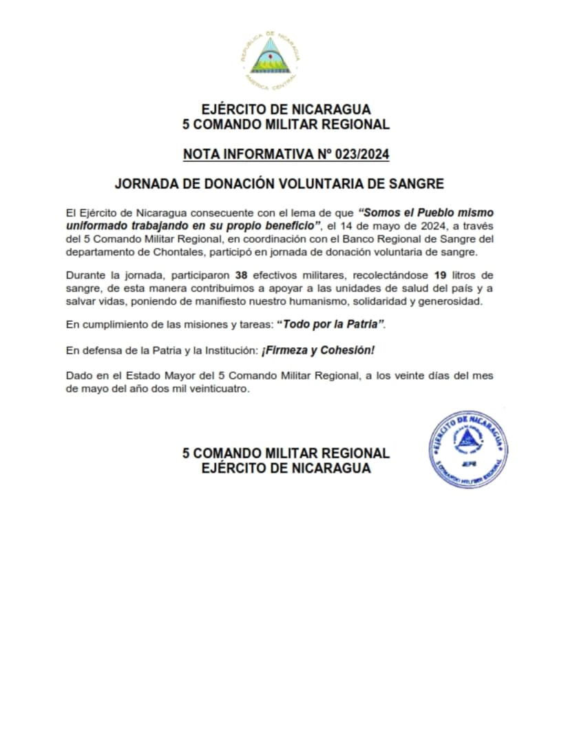 El Ejército de Nicaragua consecuente con el lema de que "Somos el Pueblo mismo uniformado trabajando en su propio beneficio", el 14 de mayo de 2024, a través del 5 Comando Militar Regional, en coordinación con el Banco Regional de Sangre del departamento de Chontales, participó en jornada de donación voluntaria de sangre. Durante la jornada, participaron 38 efectivos militares, recolectándose 19 litros de sangre, de esta manera contribuimos a apoyar a las unidades de salud del país y a salvar vidas, poniendo de manifiesto nuestro humanismo, solidaridad y generosidad. En cumplimiento de las misiones y tareas: "Todo por la Patria".