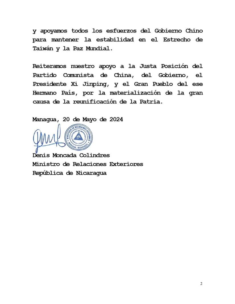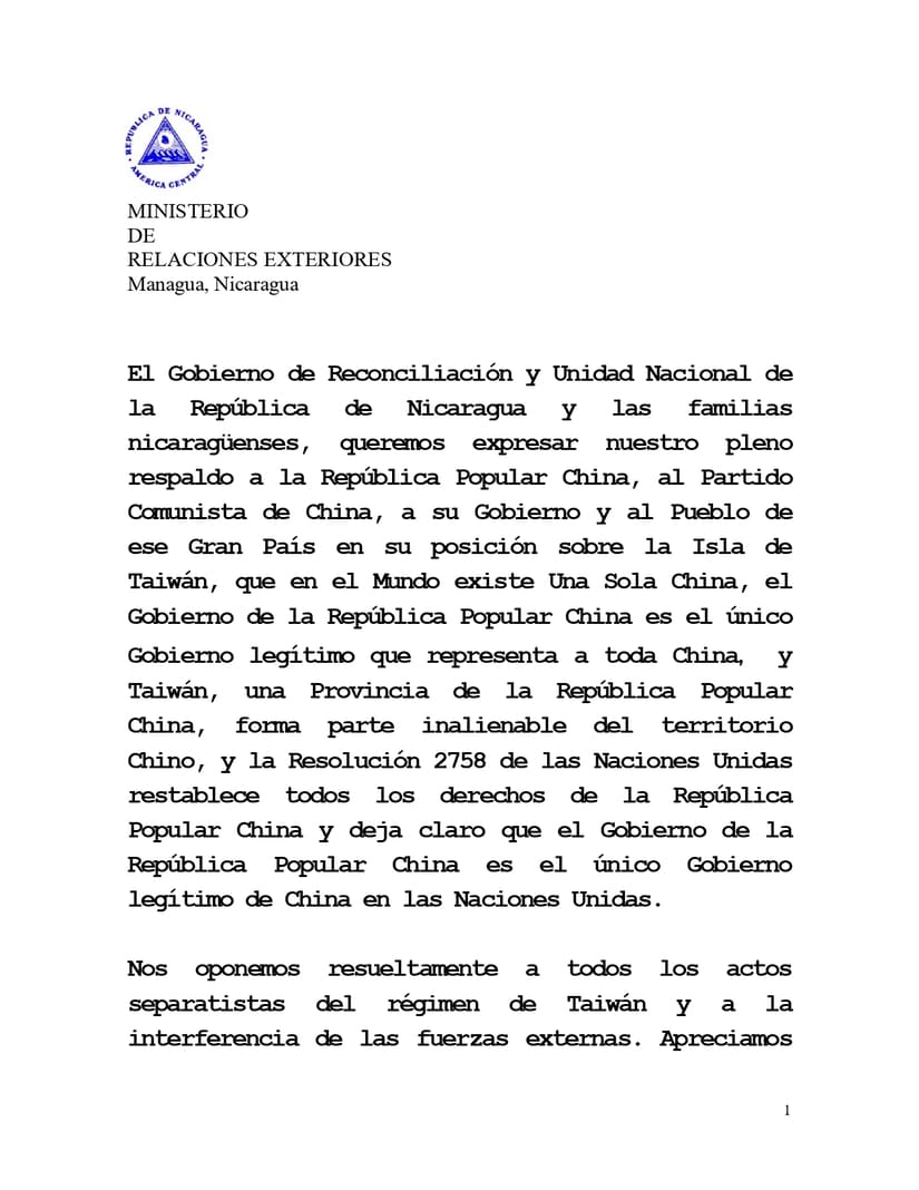 El Gobierno de Reconciliación y Unidad Nacional de la República de Nicaragua y las familias nicaragüenses, queremos expresar nuestro pleno respaldo a la República Popular China, al Partido Comunista de China, a su Gobierno y al Pueblo de ese Gran País en su posición sobre la Isla de Taiwán, que en el Mundo existe Una Sola China, el Gobierno de la República Popular China es el único Gobierno legítimo que representa a toda China, y Taiwán, una Provincia de la República Popular China, forma parte inalienable del territorio Chino, y la Resolución 2758 de las Naciones Unidas restablece todos los derechos de la República Popular China y deja claro que el Gobierno de la República Popular China es el único Gobierno legítimo de China en las Naciones Unidas.