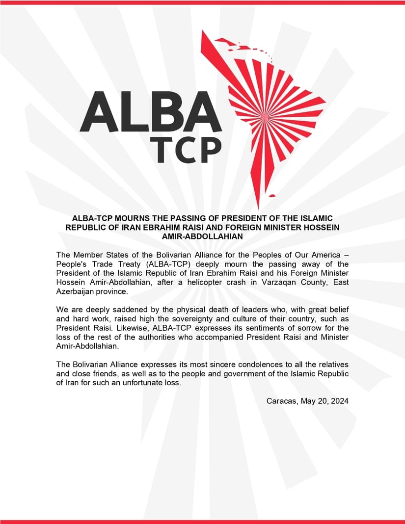 The Member States of the Bolivarian Alliance for the Peoples of Our America – People's Trade Treaty (ALBA-TCP) deeply mourn the passing away of the President of the Islamic Republic of Iran Ebrahim Raisi and his Foreign Minister Hossein Amir-Abdollahian, after a helicopter crash in Varzaqan County, East Azerbaijan province.