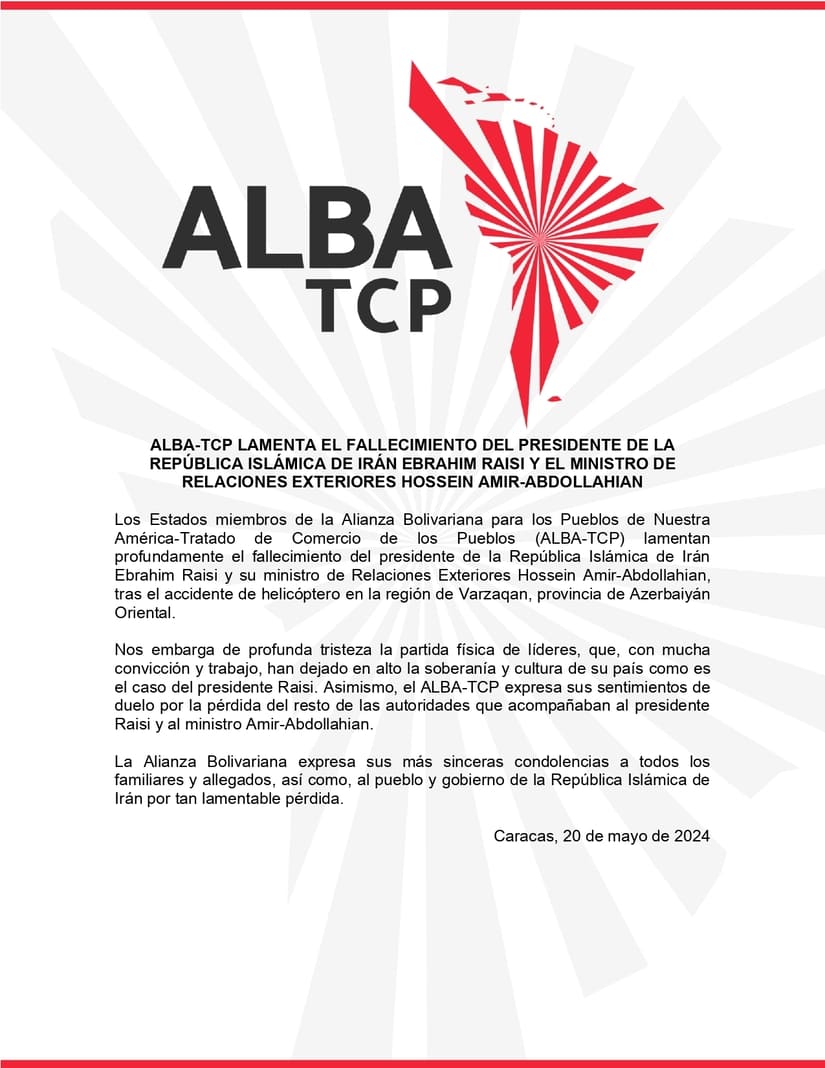 Los Estados miembros de la Alianza Bolivariana para los Pueblos de Nuestra América-Tratado de Comercio de los Pueblos (ALBA-TCP) lamentan profundamente el fallecimiento del presidente de la República Islámica de Irán Ebrahim Raisi y su ministro de Relaciones Exteriores Hossein Amir-Abdollahian, tras el accidente de helicóptero en la región de Varzaqan, provincia de Azerbaiyán Oriental.