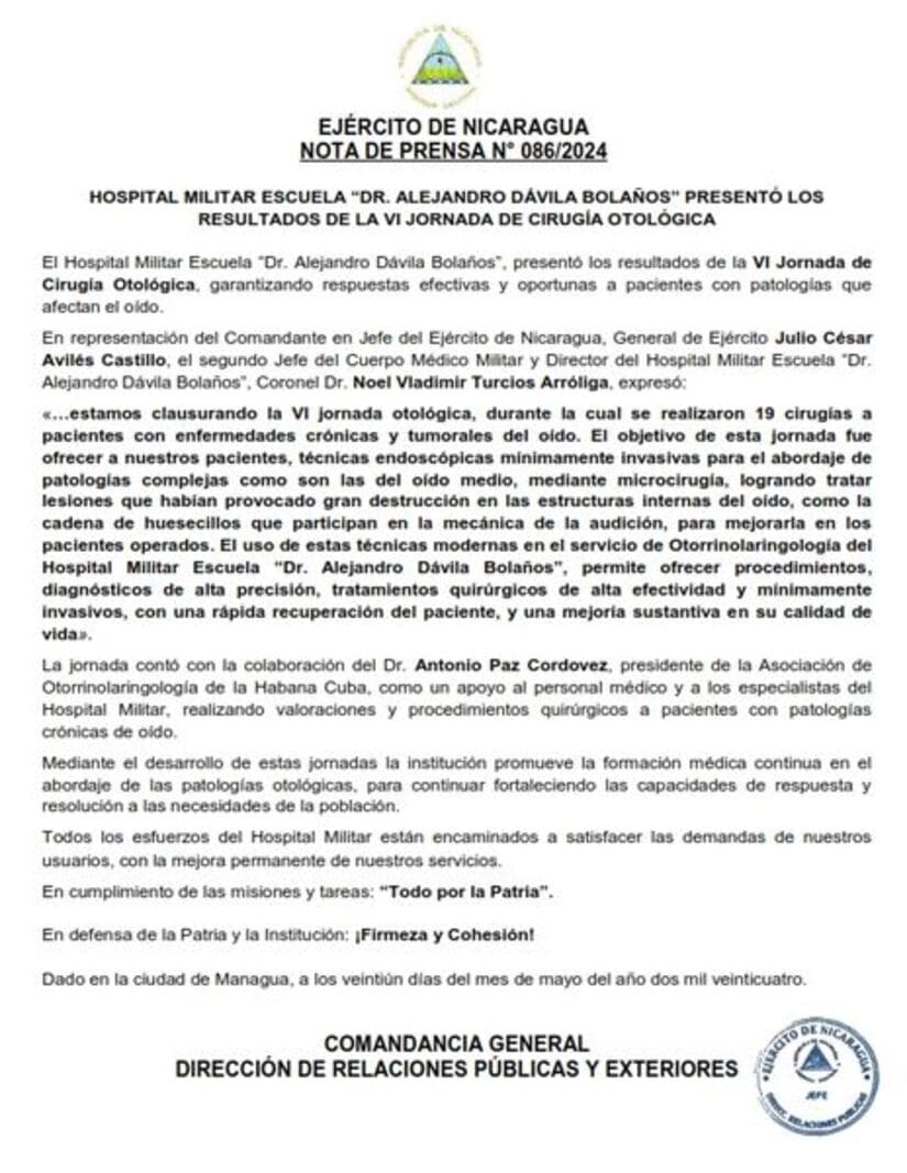 El Hospital Militar Escuela "Dr. Alejandro Dávila Bolaños", presentó los resultados de la VI Jornada de Cirugía Otológica, garantizando respuestas efectivas y oportunas a pacientes con patologías que afectan el oído.