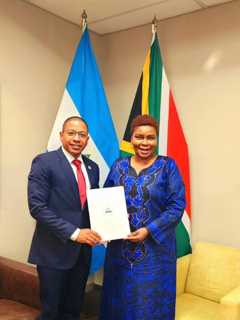 La presentación de Copias de Estilo fue ante la Jefa de Protocolo de Estado H.E. Embajadora NONCEBA LOSI-TUTU. Quien manifestó estar contenta por la instalación física de la embajada de Nicaragua después de 30 años de relaciones diplomáticas entre ambos países hermanos. De igual manera, agradeció al gobierno que preside el Presidente Comandante Daniel Ortega Saavedra y la Vicepresidenta Rosario Murillo por el apoyo incondicional en los distintos foros internacionales en la construcción de un nuevo orden mundial, multipolar basado en el respeto de la Soberanía, la Independencia y Autodeterminación de los Pueblos.