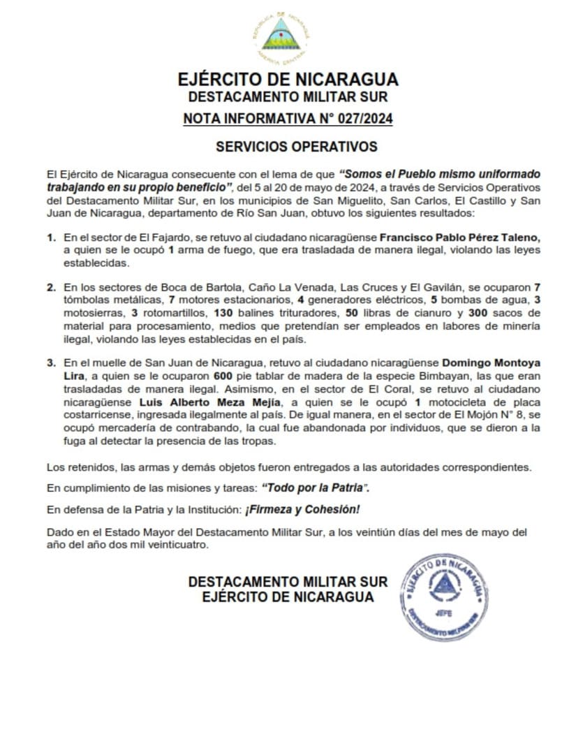 El Ejército de Nicaragua consecuente con el lema de que "Somos el Pueblo mismo uniformado trabajando en su propio beneficio", del 5 al 20 de mayo de 2024, a través de Servicios Operativos del Destacamento Militar Sur, en los municipios de San Miguelito, San Carlos, El Castillo y San Juan de Nicaragua, departamento de Rio San Juan, obtuvo los siguientes resultados: