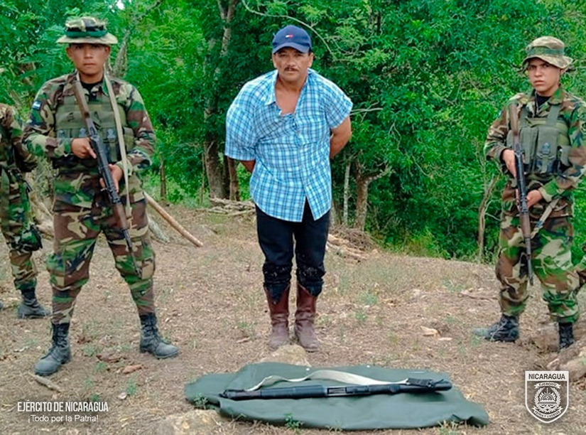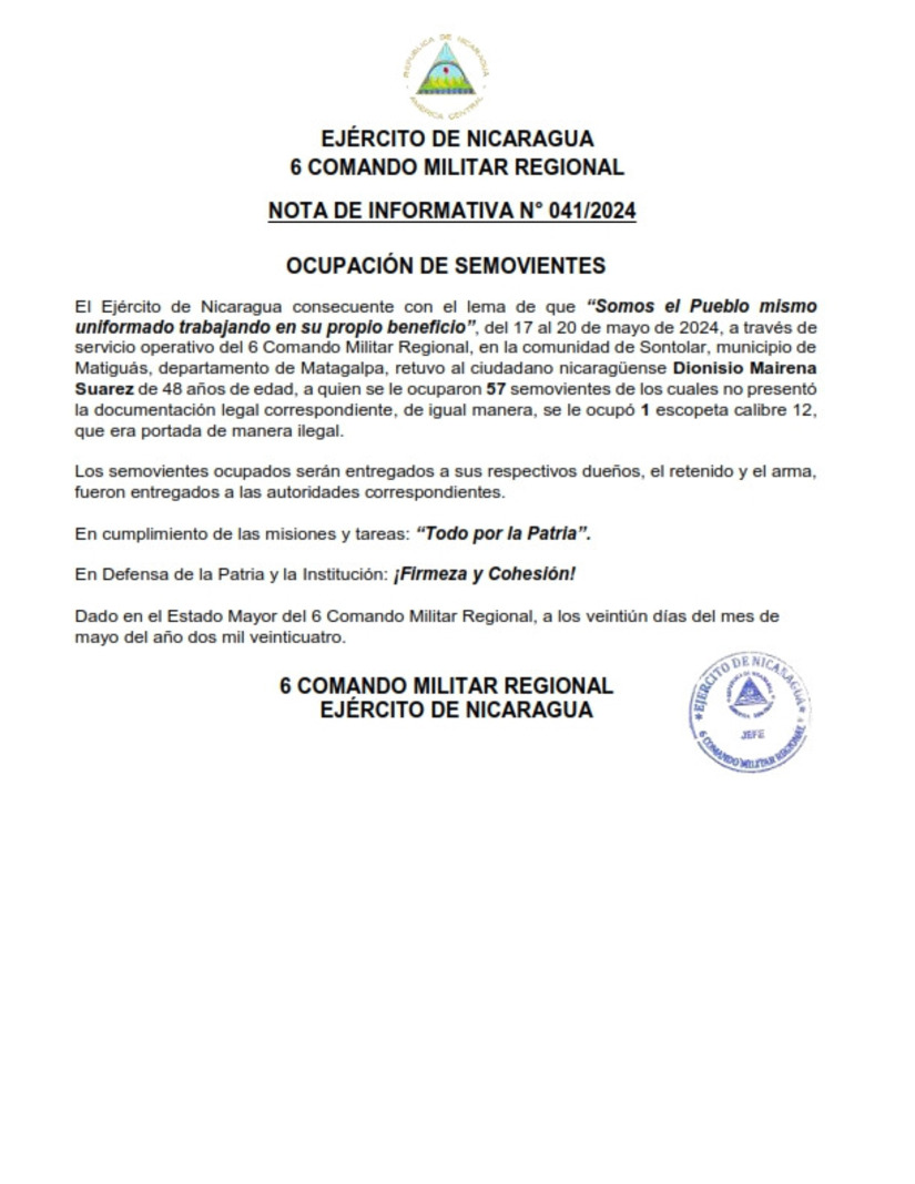El Ejército de Nicaragua consecuente con el lema de que "Somos el Pueblo mismo uniformado trabajando en su propio beneficio", del 17 al 20 de mayo de 2024, a través de servicio operativo del 6 Comando Militar Regional, en la comunidad de Sontolar, municipio de Matiguás, departamento de Matagalpa, retuvo al ciudadano nicaragüense Dionisio Mairena Suarez de 48 años de edad, a quien se le ocuparon 57 semovientes de los cuales no presentó la documentación legal correspondiente, de igual manera, se le ocupó 1 escopeta calibre 12, que era portada de manera ilegal.